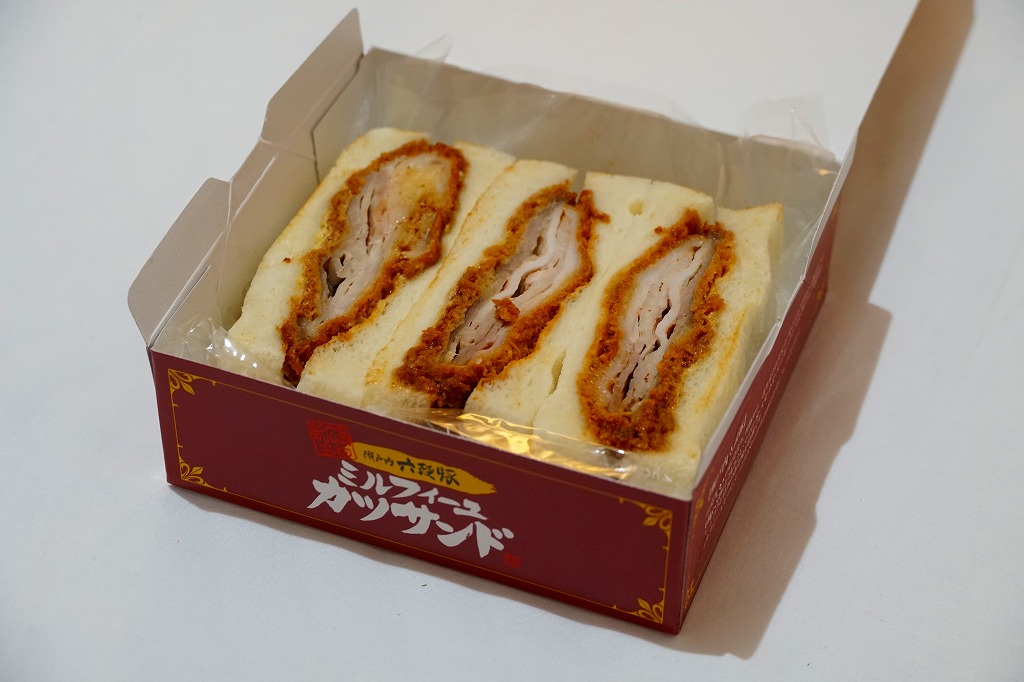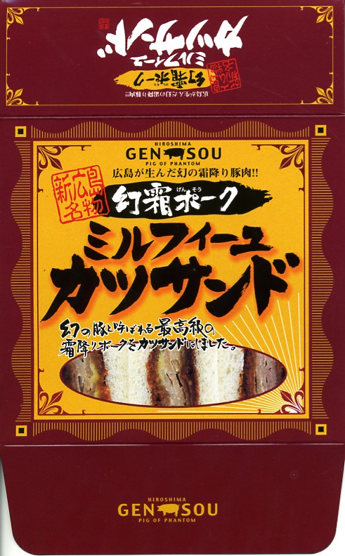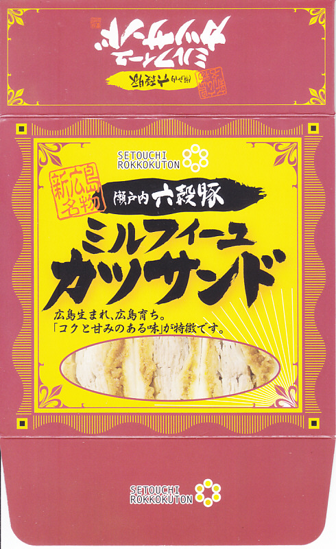 2007(平成19)年12月に、「すきやき弁当」「カツレツ弁当」に次ぐ幻霜ポーク駅弁第3弾として、「幻霜ポークミルフィーユカツサンド」の名前で発売、2012(平成24)年7月25日に「六穀豚ミルフィーユカツサンド」と名前を変えて再発売。霜降り豚肉の薄切り重ねフライのソース漬けを、マスタード入りマヨネーズを塗った耳なし食パンで挟んだカツサンドを3切れ、袋詰めにして紙箱に収めて、さらにラップで密封する。