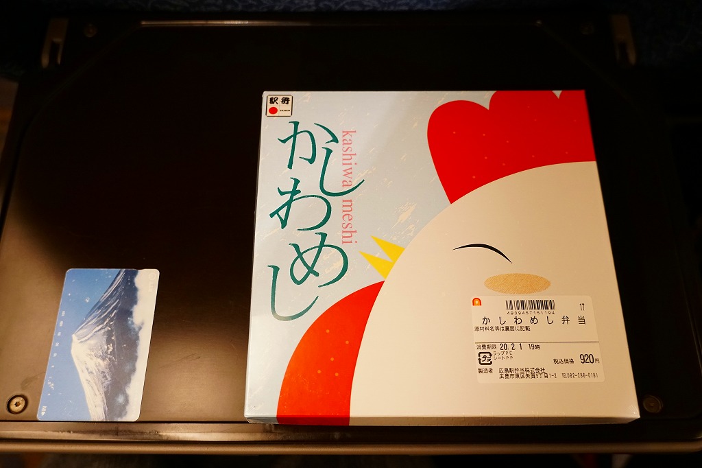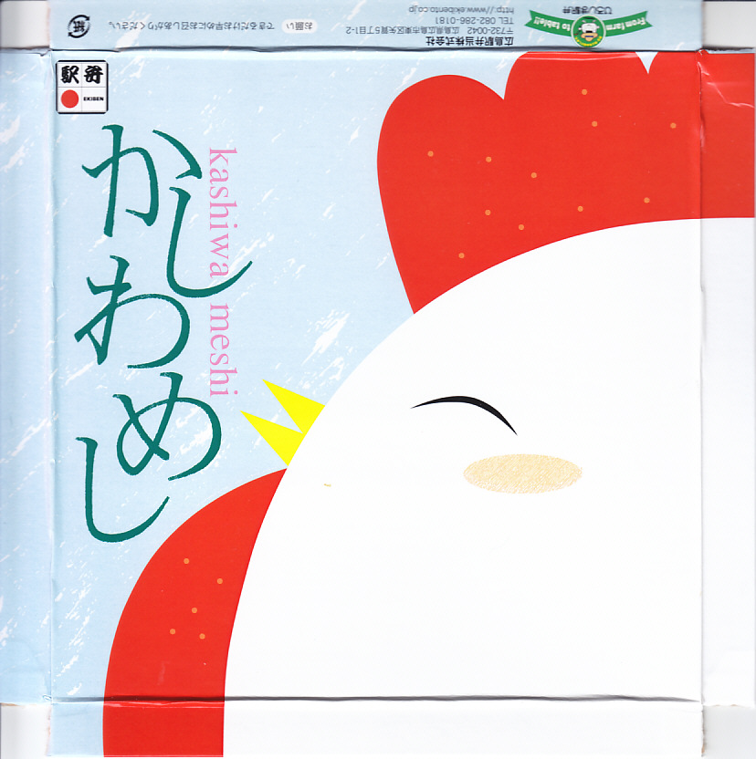 山口県の山陽本線小郡駅改め新山口駅で、半世紀以上親しまれた駅弁「かしわめし」が、駅弁屋の撤退により広島駅の駅弁屋に移籍し、2017(平成29)年に新山口駅や広島駅で改めて発売されたもの。ふたの絵柄が新山口駅のものを引き継いでいるのは、そのためだろう。