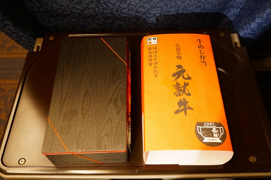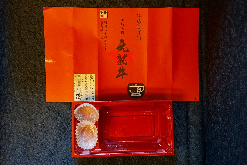2019(平成31・令和元)年の5月までに発売か。駅弁の名前などを描く、赤くシンプルな掛紙を巻かれた長方形の容器の中身はつまり牛丼で、白御飯をすき焼き肉とタマネギで覆い、広島菜漬といちごわらびもちを添えるもの。牛肉に広島県血統を引き継ぎ県内のみで育てた、牛枝肉取引規格の等級「B−3」以上のブランド牛「広島血統和牛元就」、つまり広島県産牛を使うようだ。1年間ほどの販売か。