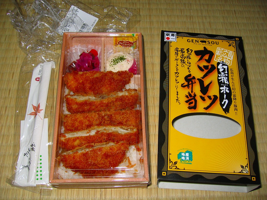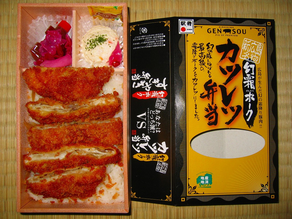 2008(平成20)年2月16日に購入した、広島駅弁の紙箱。上記の「瀬戸内六穀豚ミルフィーユカツサンド」は、2007年12月の発売時から2012年7月まで、この名前で売られた。中身や味は同じだと感じる。