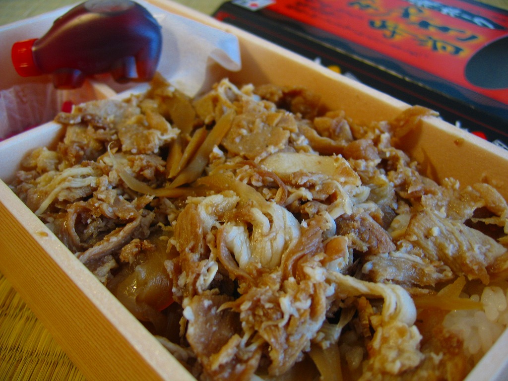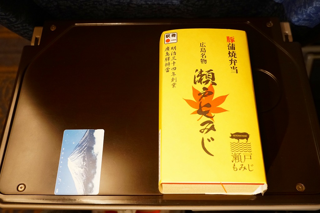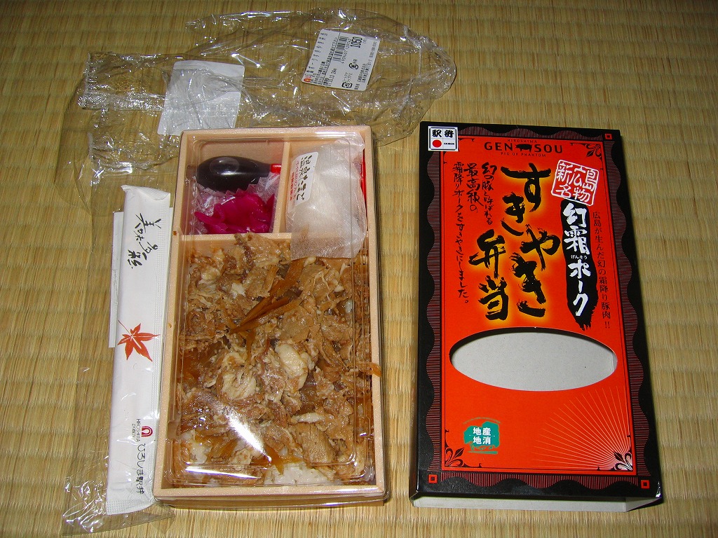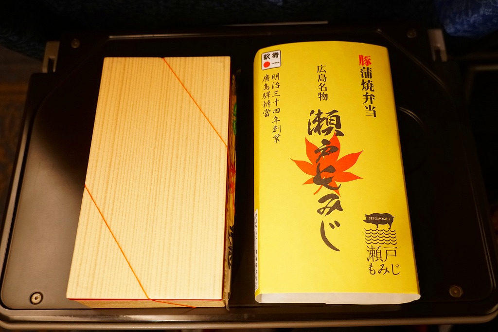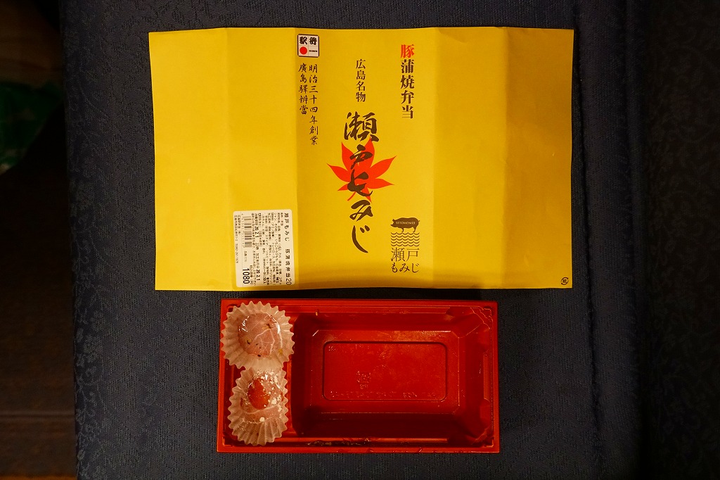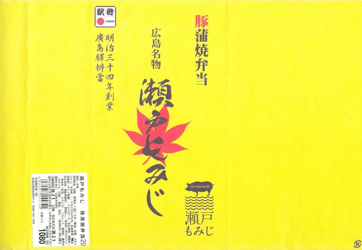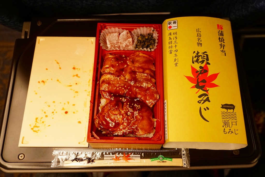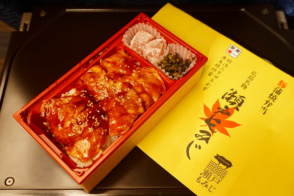 2019(平成31・令和元)年の5月までに発売か。駅弁の名前などを描く、黄色くシンプルな掛紙を巻かれた長方形の容器の中身はつまり豚丼で、白御飯をタレをたっぷりまとう3枚の豚肉で覆い、広島菜漬といちごわらびもちを添えるもの。豚肉に広島県の庄原地区の生産者4戸が2013年頃からつくる、飼料に牡蠣殻粉末を混ぜて育てた広島食肉市場肉豚出荷組合のブランド豚「瀬戸もみじ」を使うようだ。1年間ほどの販売か。