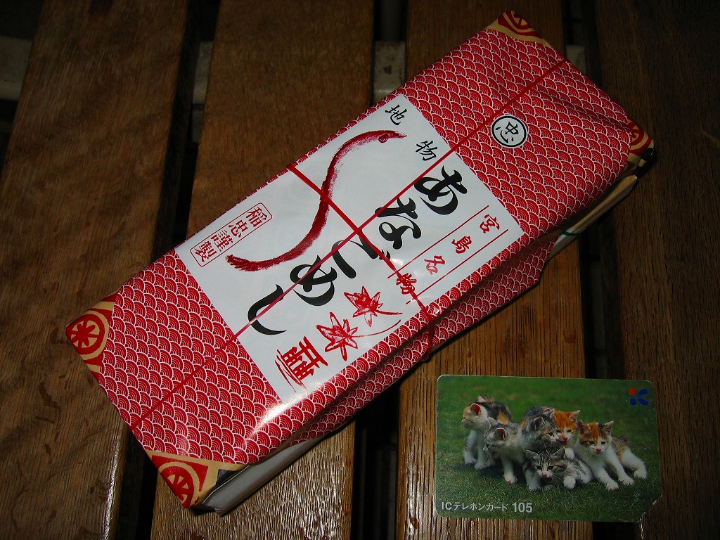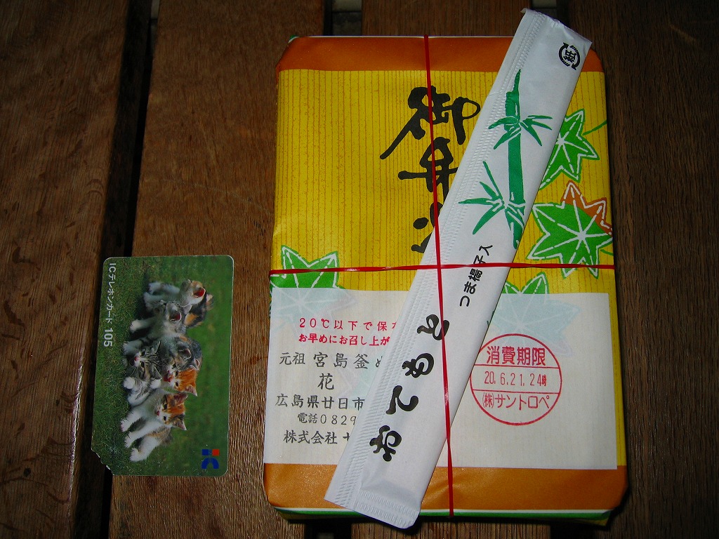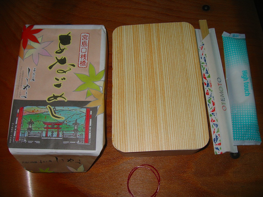 宮島で見つけた、街弁版あなごめし。2008年の訪問時で、宮島の島内で3軒、宮島口の港と駅の間で駅弁屋を含め2軒、あなごめしの弁当での販売があった。細長い経木折をラップで丸ごと包み、ボール紙でふたをして包装紙で包み、商品名を書いた掛紙をかけて輪ゴムで留める。中身は宮島名物あなごめし。蒲鉾のような食感で穴子の臭みが個性的。価格は2008年の購入時で1,300円、同じ包装紙と掛紙を使い分量が多い「(大)」は1,700円。2023年時点で、2,000円と2,300円。
