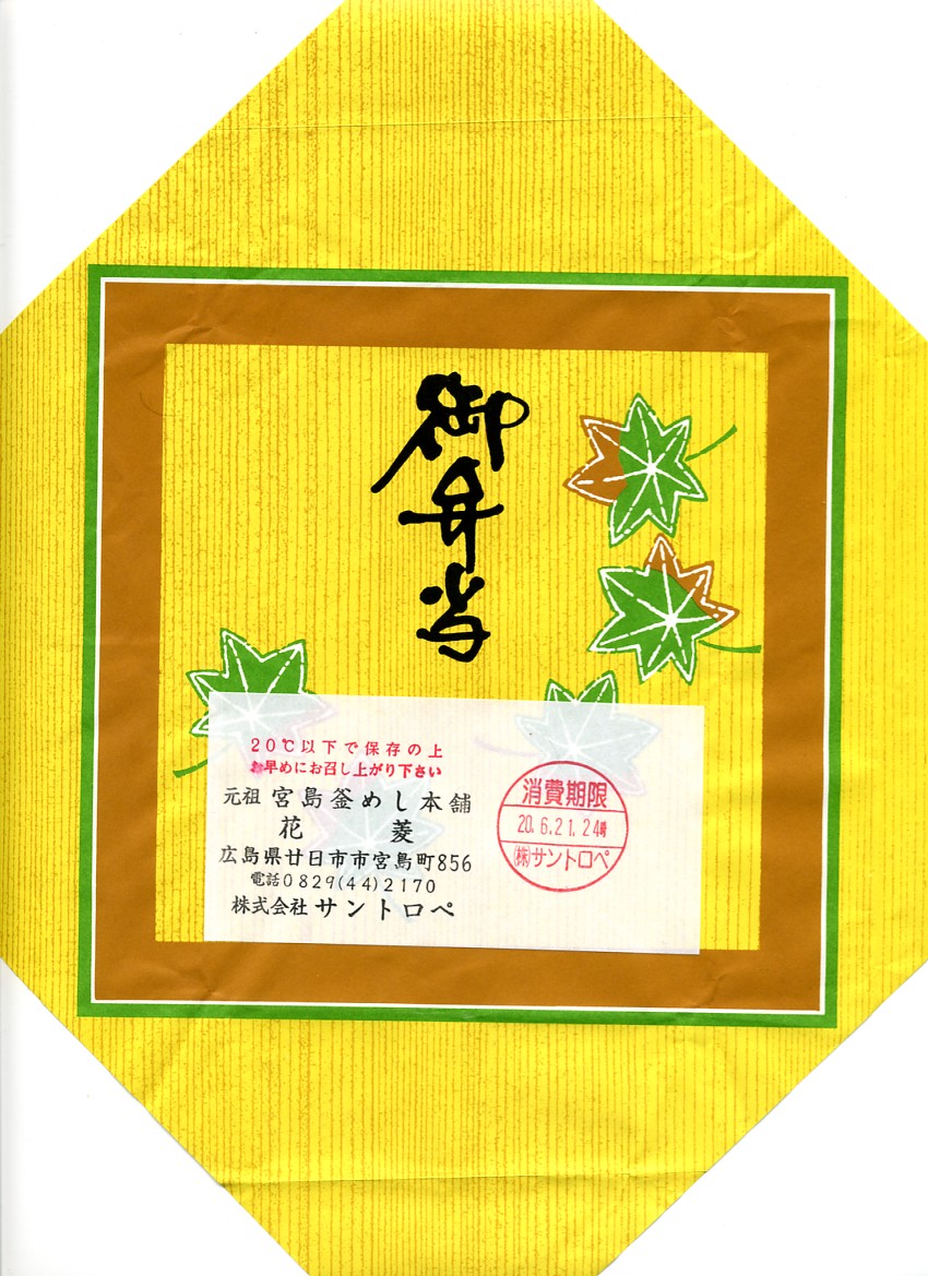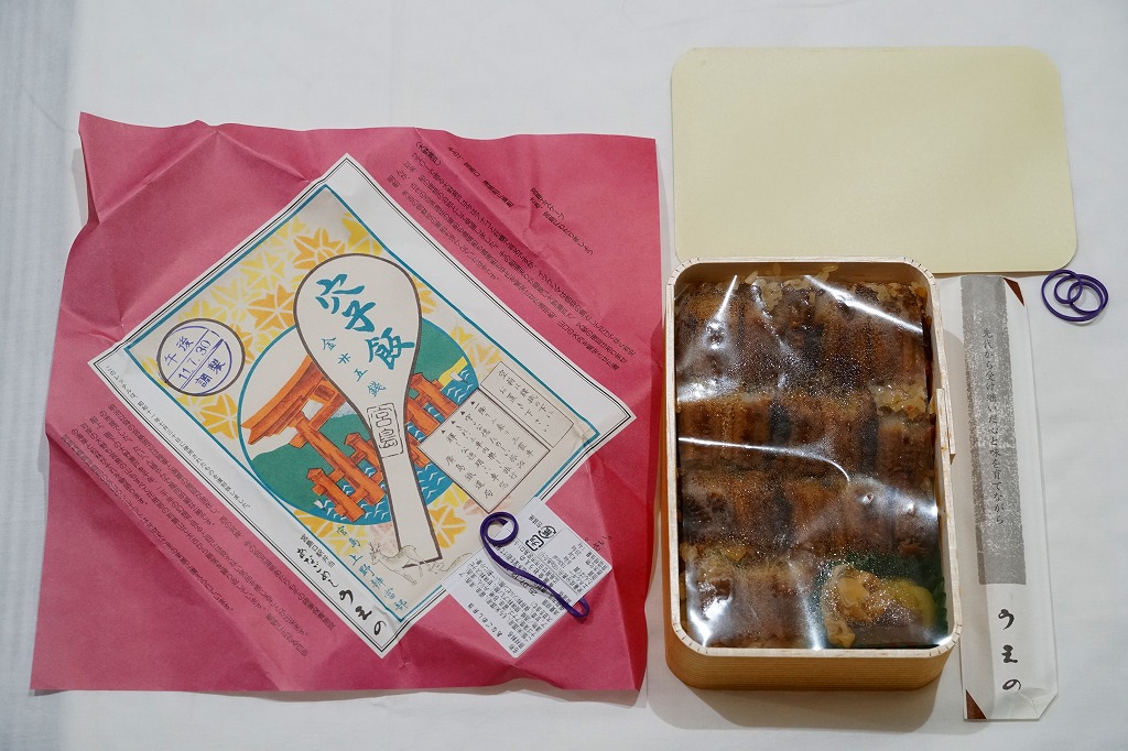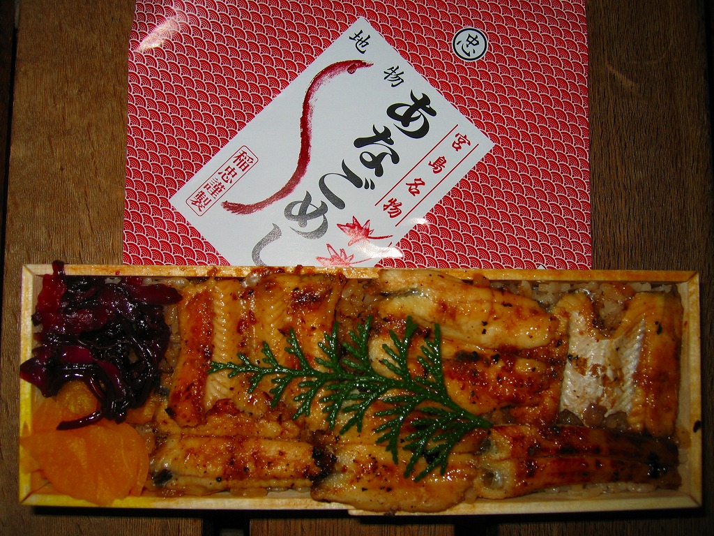 宮島口駅弁のあなごめしの「(大)」版で、2019年に発売か。これは駅でも駅弁の輸送販売や実演販売では買えず、宮島駅前の調製元で繁忙期を除き注文できる。作り置きはしないようで、店頭の弁当窓口で注文して、しばし待つ。掛紙と中身は駅弁のものとまったく同じ。経木折が少し大きく正方形になり、内容量が3割ほど増えた感じで、価格は2割増し。