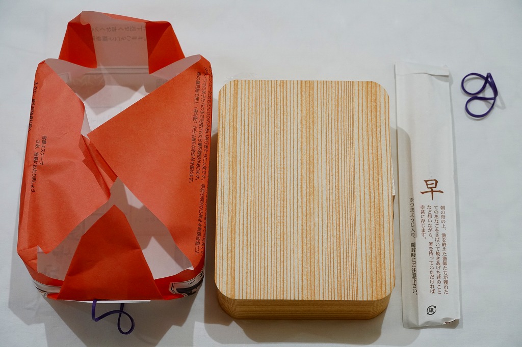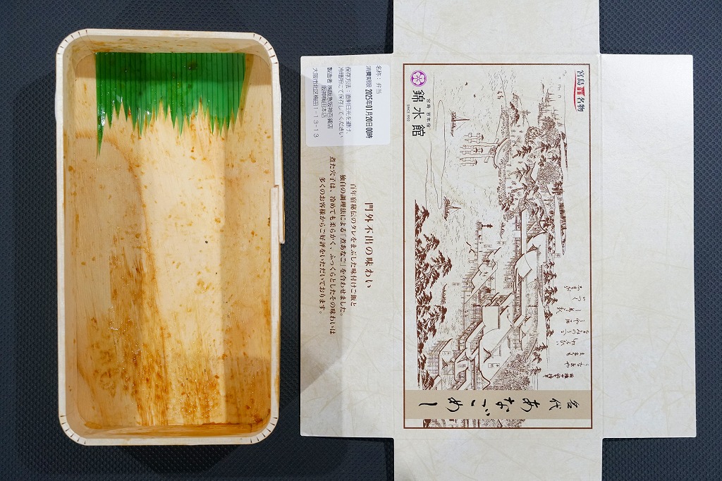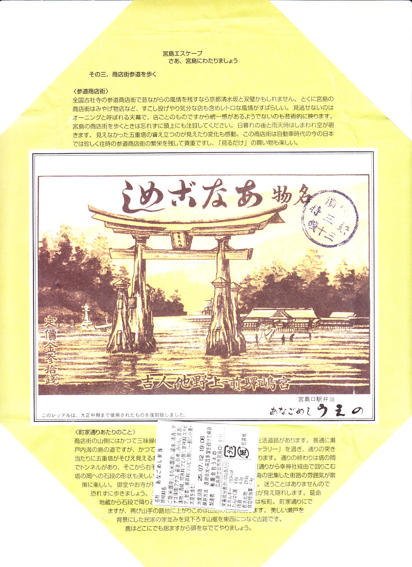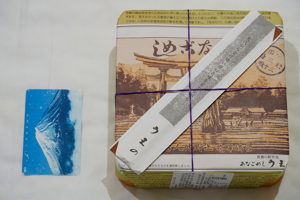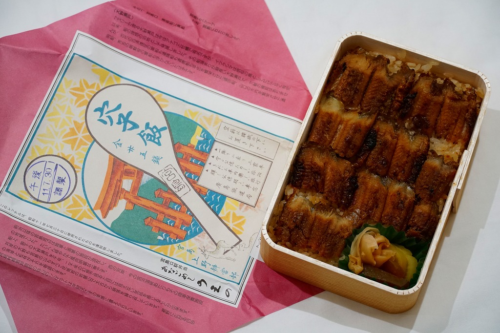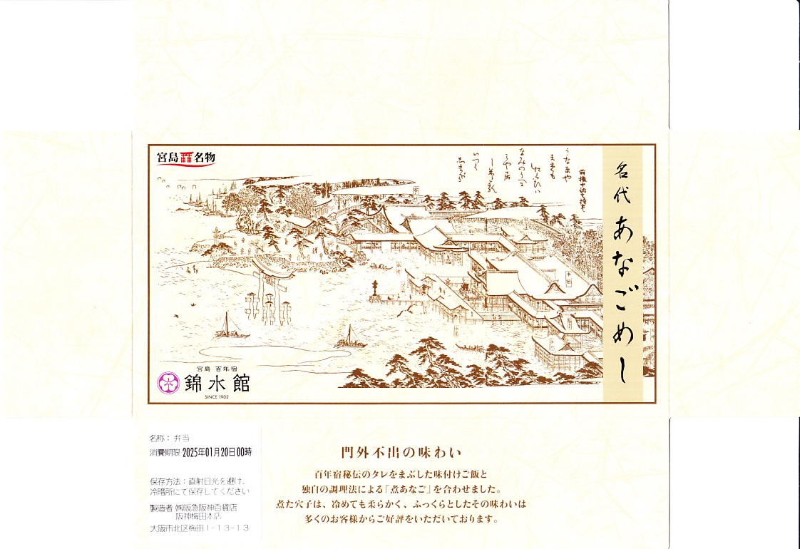 宮島の旅館を名乗るあなごめし。現地でなく、大阪梅田の阪神百貨店で購入。あとで調べると、旅館の紹介に穴子飯はなく、このブランドでネット通販や催事出店を行い、宮島でこの商品を売ることはないらしい。経木折にタレ御飯を詰め、錦糸卵と薄くて柔らかい焼アナゴで覆い、漬物を添えて、宮島神社を描いた掛紙でふたをする。味はどちらかといえば、宮島の島内や港で買ったり食べられる歯応えのあるものではなく、広島駅や福山駅の駅弁のように溶けるような柔らかさのあるものであった。もし2025年1月に阪神百貨店の駅弁大会があれば、そこに出店しただろうか。