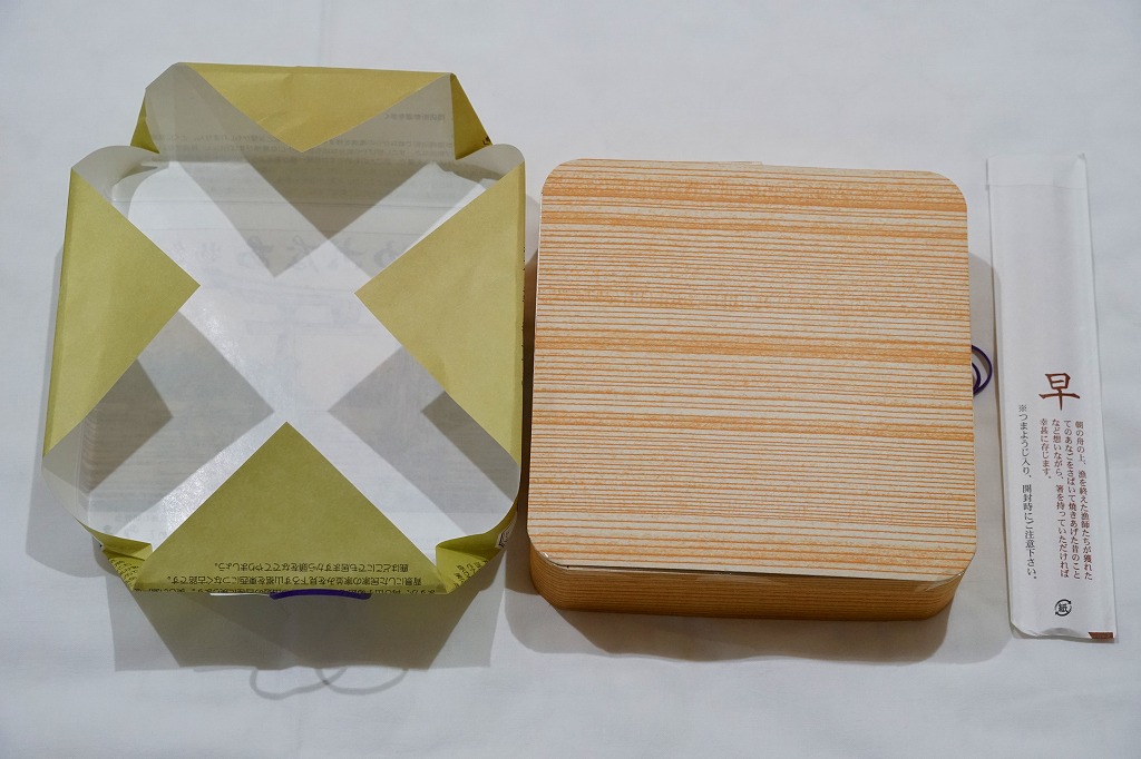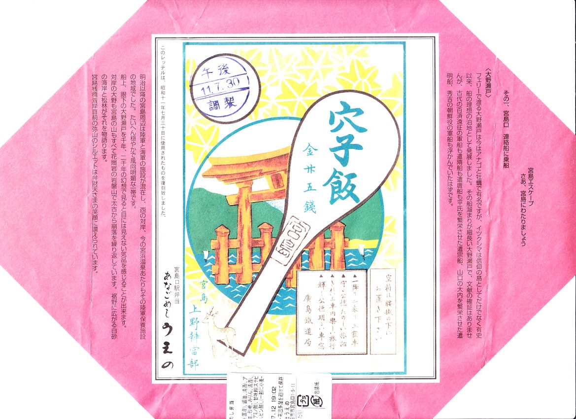 宮島口駅弁のあなごめしの「(小)」版で、2019年に発売か。これは駅でも駅弁の輸送販売や実演販売では買えず、宮島駅前の調製元で繁忙期を除き注文できる。作り置きはしないようで、店頭の弁当窓口で注文して、しばし待つ。掛紙と中身は駅弁のものとまったく同じ。長方形の経木折が2割ほど小さくなった感じで、内容量もそれだけ減り、価格は1割引き。