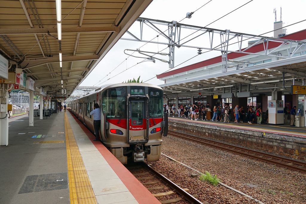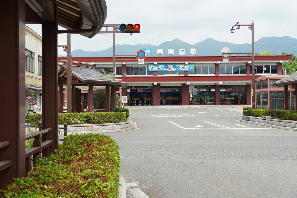 広島駅から山陽本線で約30分。国重要文化財で世界文化遺産の厳島神社を抱える、古来から参拝客や観光客を集め日本三景に数えられる宮島への玄関口として、駅が設けられ、鉄道連絡船やフェリーが発着する。駅弁は明治時代からの駅弁屋「うえの」が「あなごめし」1種類のみを百年以上売り続ける。1897(明治30)年9月25日開業、広島県廿日市市宮島口一丁目。