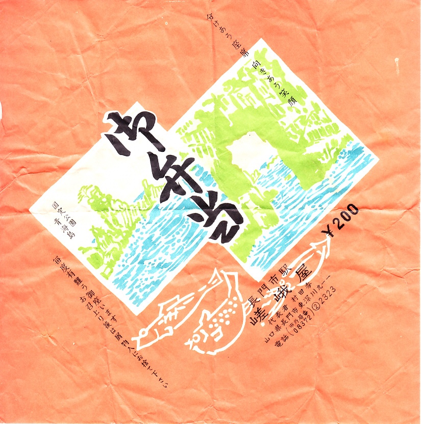 1970年代のものと思われる、昔の長門市駅弁の掛紙。国定公園青海島をふたつ描く。長門市駅では1920年代から1980年代まで駅弁が売られたが、どうも販売した弁当は1970年代の「おにぎり弁当」以外は幕の内だけだったようで、紹介例を見たことがなく、残された駅弁掛紙もほとんどみない。