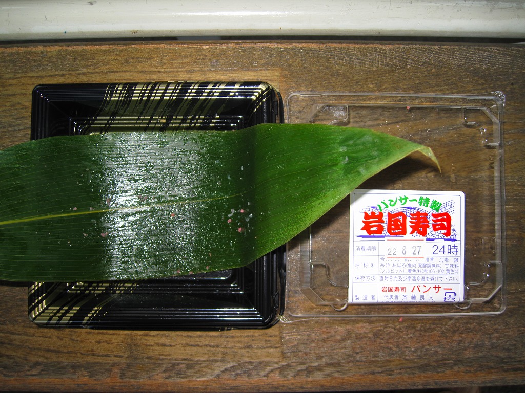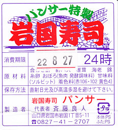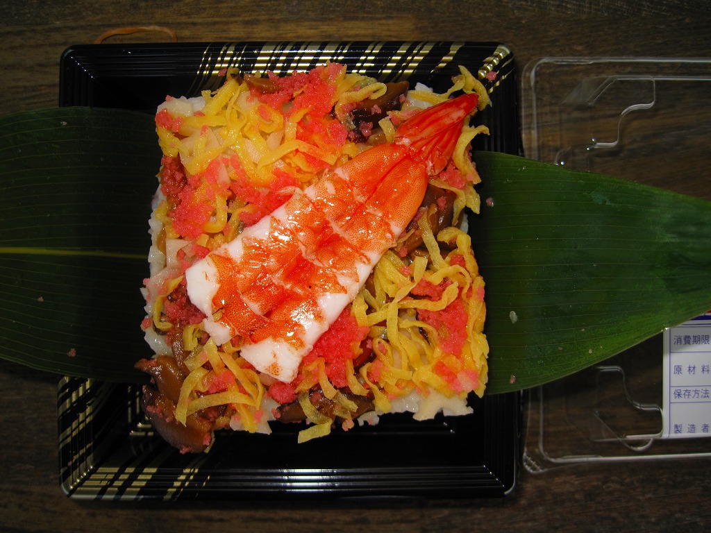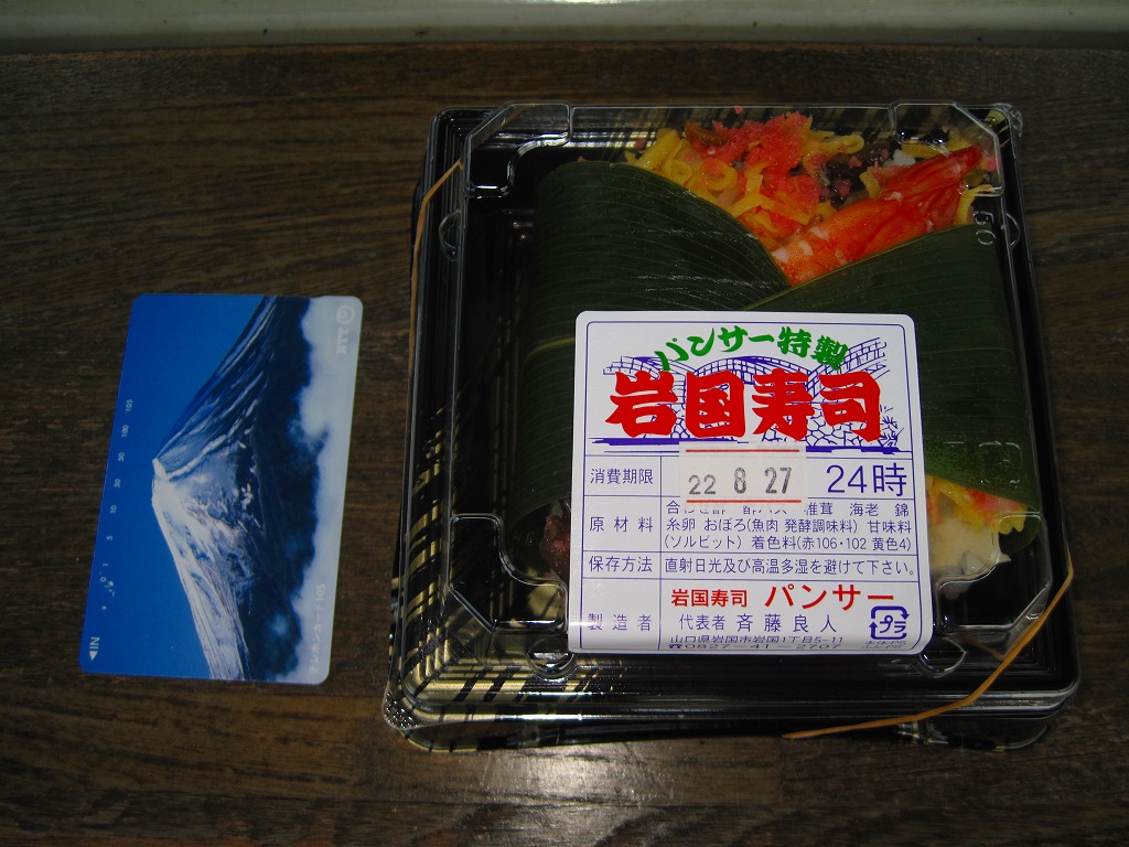 新岩国駅のキヨスクで売られていた、山口県岩国の郷土料理「岩国寿司」のお惣菜。御飯に合わせ酢を混ぜて敷き、シイタケやエビや錦糸卵や魚肉などを散らし、また酢飯を敷いて具を散らし、これを繰り返した上でまとめて押し潰して切り分けるサンドイッチ。新潟県の上越地方や長崎県の大村でも見たような、甘めな積層ちらし押寿司。1,050円のものも売られていた。