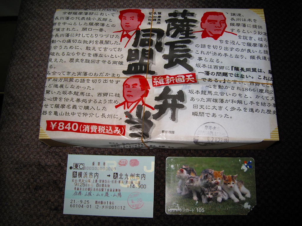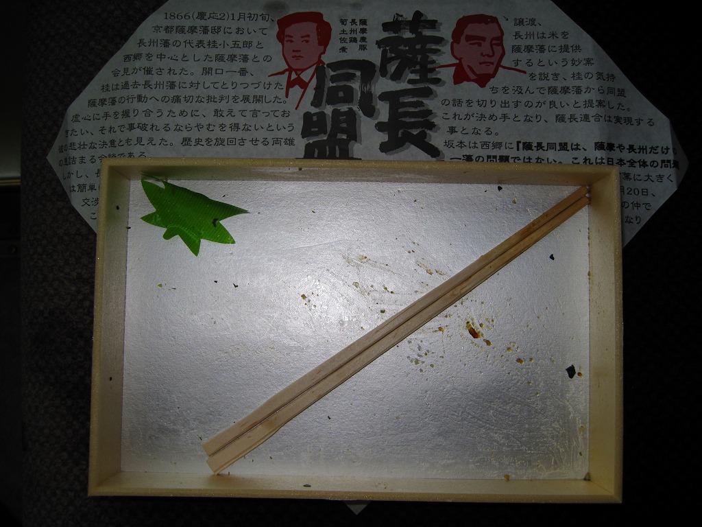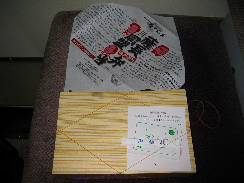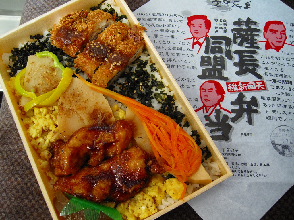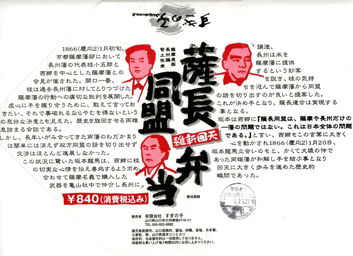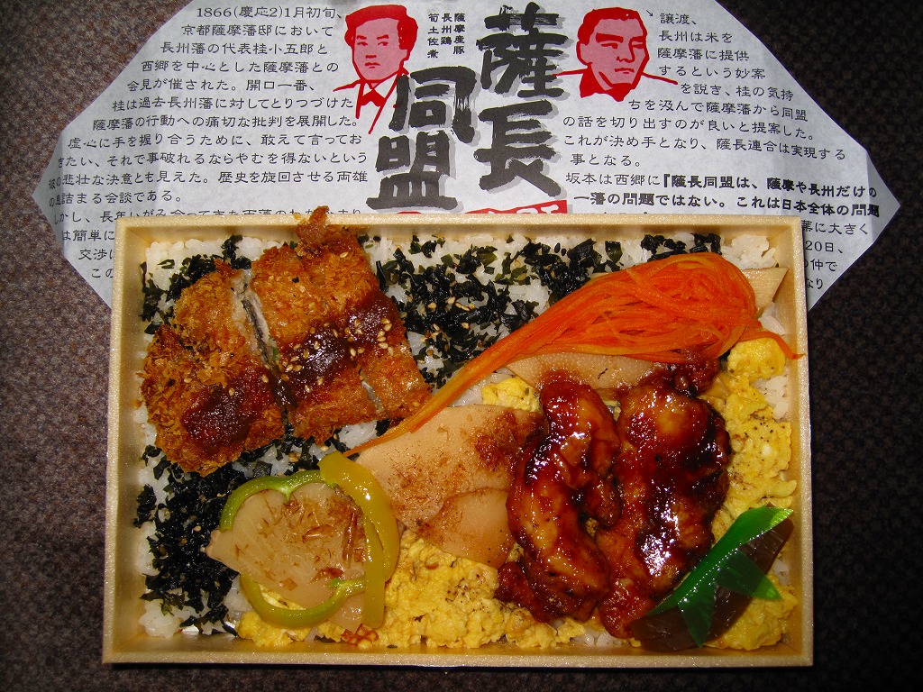 2004(平成16)年7月17日に発売された、山口駅で約20年ぶりの駅弁。長方形の容器に木目柄のボール紙でふたをして輪ゴム2本で留め、長方形の容器に維新の面々と文句を記したとても薄い掛紙をかけてまた輪ゴム2本で留める。中身は山口県産コシヒカリの白御飯を一面に敷いたうえで、左上を薩摩として海苔を振り黒豚のトンカツを載せ、右下を長州として卵とじをかけ鶏くわ焼を載せ、その間を土佐としてタケノコ土佐煮を並べる。ニンジンと漬物も添付。価格は2009年の購入時で840円、2014年4月の消費税率改定で864円。2016年頃までの販売か。