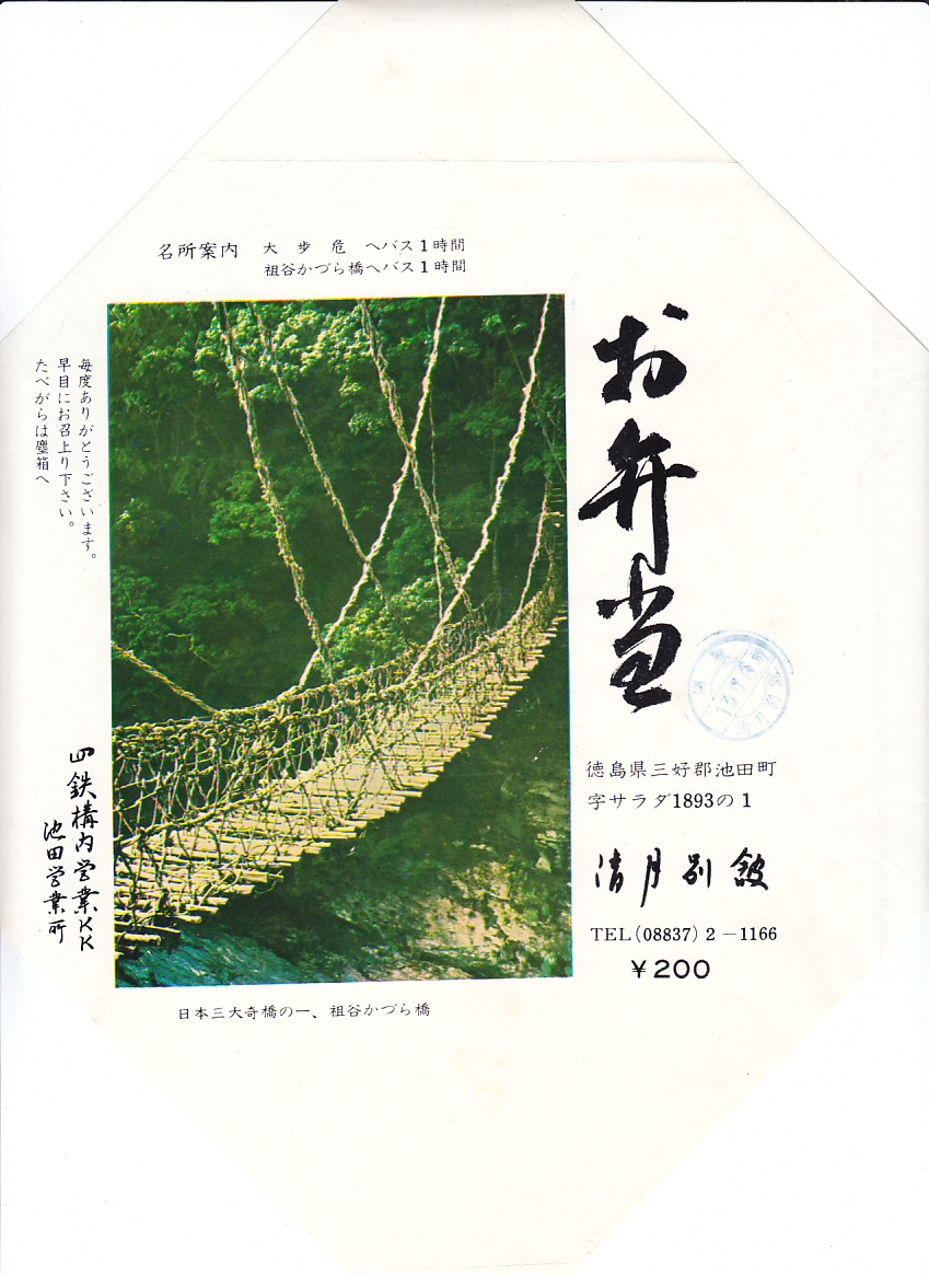 1970年代のものと思われる、昔の阿波池田駅弁の掛紙。写真は祖谷(いや)のかづら橋。1954(昭和29)年11月に国の選択無形民俗文化財となった「蔓橋(かずらばし)の製作工程」により、シラクチカズラを編んで深い谷に架けた吊り橋で、1955(昭和30)年2月に国の重要有形民俗文化財となった「祖谷の蔓橋」は、昭和時代には四国と全国を代表する観光地として、路線バスや観光バスで観光客が押し寄せた。
