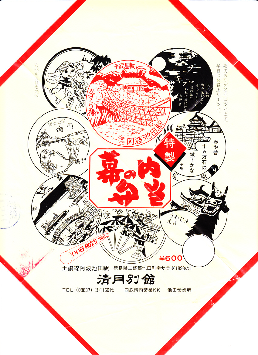 1980年代の調製と思われる、昔の阿波池田駅弁の掛紙。これは徳島、鳴門、高松、琴平、宇和島、松山、高知、阿波池田の各駅の駅スタンプの絵柄だろうか。国鉄は1980年11月に全国約740駅へ統一規格の駅スタンプと「わたしの旅スタンプ台」を設置、この掛紙はその頃に作られたのではないかと思う。
