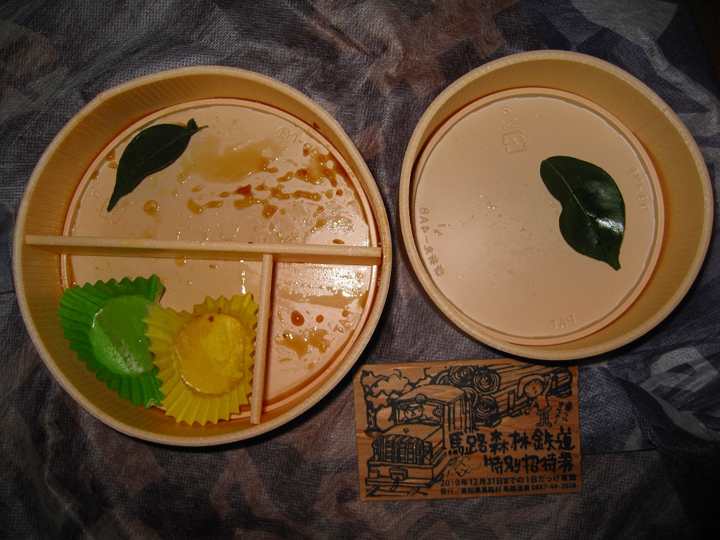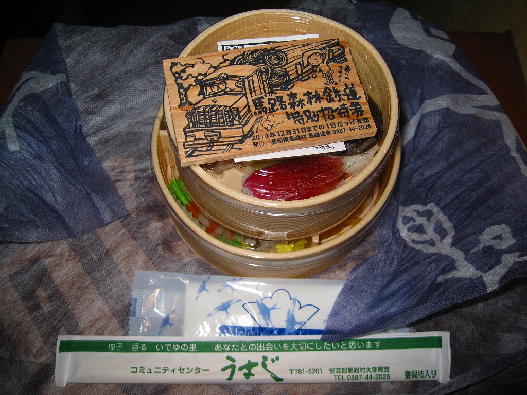 2007(平成19)年8月に、馬路温泉のミニ森林鉄道の運行日である日祝日に、一日10個の販売で発売したそうな。2010(平成22)年1月の京王百貨店の駅弁大会で、地域おこし商品として実演販売された催事弁当。円形の容器を大小2個使用、それぞれに透明なふたをして、「馬路森林鉄道特別招待券」なる木片を載せて、和紙風の風呂敷で包む。中身は上段が御飯でタケノコ、ミョウガ、シイタケ、コンニャクをネタにした柚子風味のにぎり寿司、下段がおかずでアメゴ甘露煮、山菜やカボチャなどの煮物、じゃこ、なます、ゆずようかんなど。