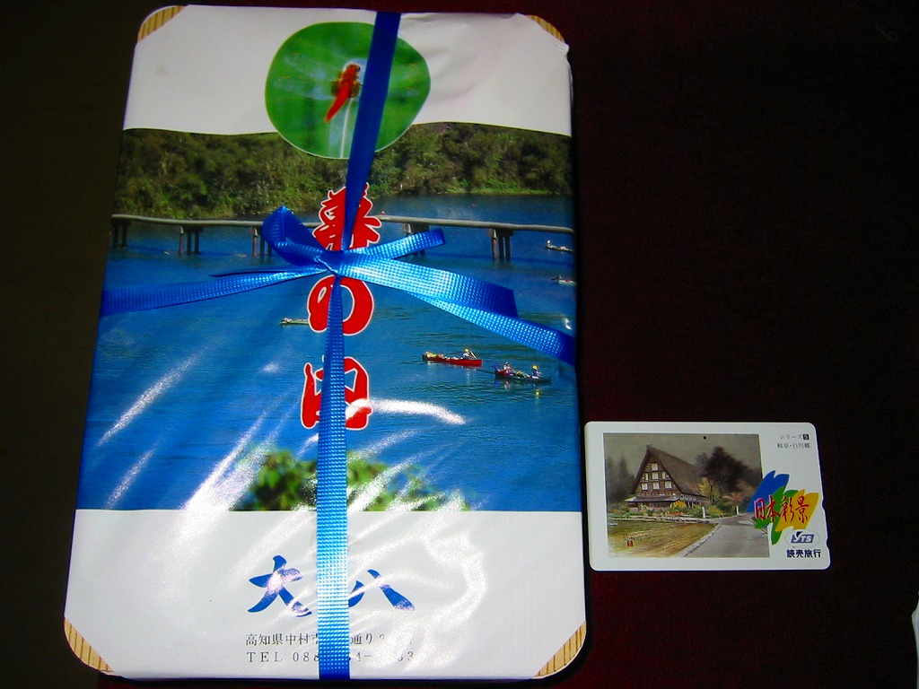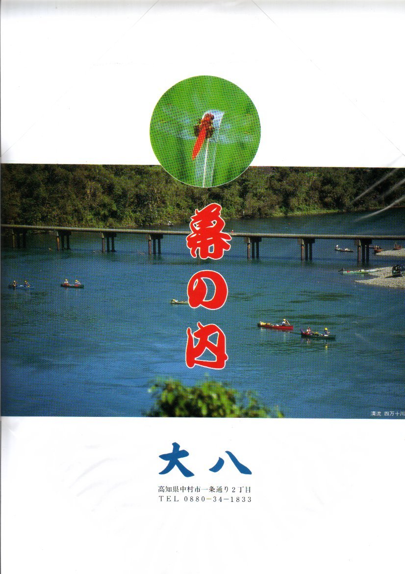 1970年代の、8月6日の調製と思われる、昔の中村駅弁の掛紙。足摺岬と1972年に開業した海中展望台の写真を使う。鉄道弘済会は1930年代、全国の構内営業者から弁当以外の販売権を召し上げてできたことから駅弁屋でなかったが、1970年代には帯広駅や東室蘭駅や釜石駅や宮古駅など、自らが駅弁屋になることがあった。中村駅でも駅のキヨスクで駅弁を売った。この掛紙には「中村駅弁調製」と書いてある。
