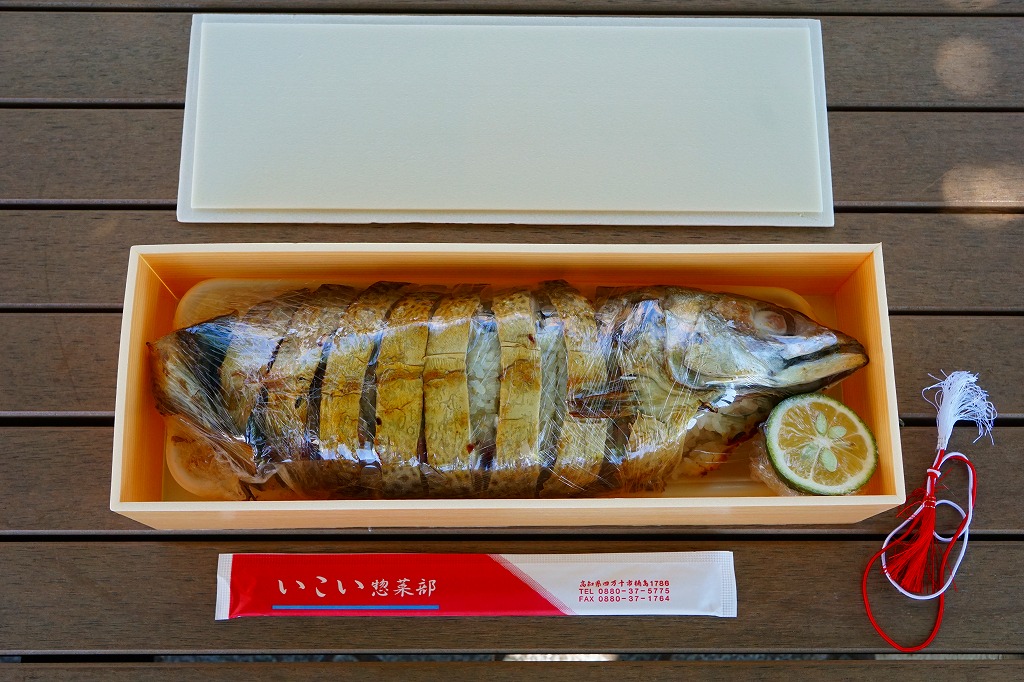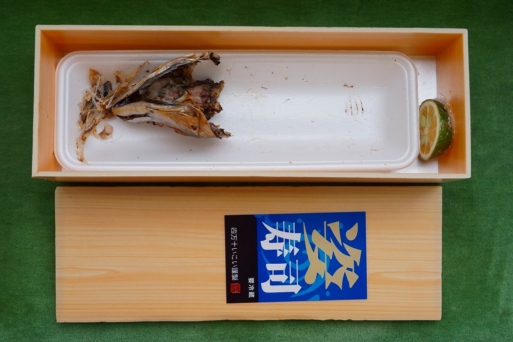 ワインのハーフボトルが入りそうな箱に、スーパーの白い発泡材トレーに置いてラップでぐるぐる巻きにした、サバの姿寿司を1本まるごと収める。商品名のシールには「要冷蔵」とあるが、アツアツの状態で受け取った。