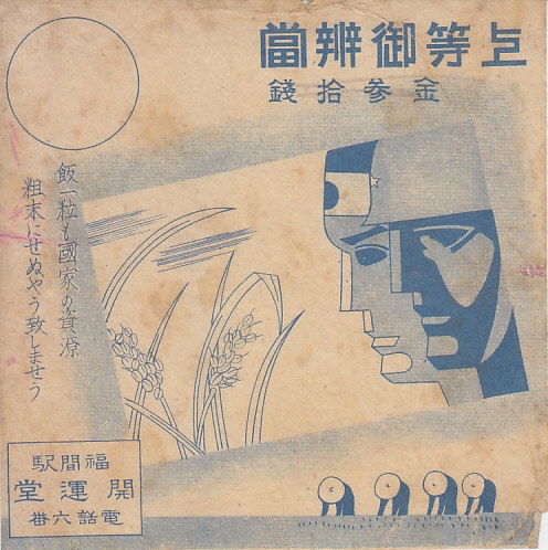 1940年代のものと思われる、昔の福間駅弁の掛紙。稲作と兵士と標語で、戦時を思わせる絵柄。調製元の開運堂は1916年に福間駅前で倉元岩五郎が創業した駅弁屋で、1942年に博多駅弁の博多鉄道構内営業(寿軒)が買収または統合した。