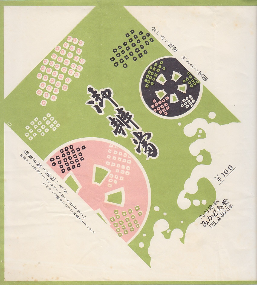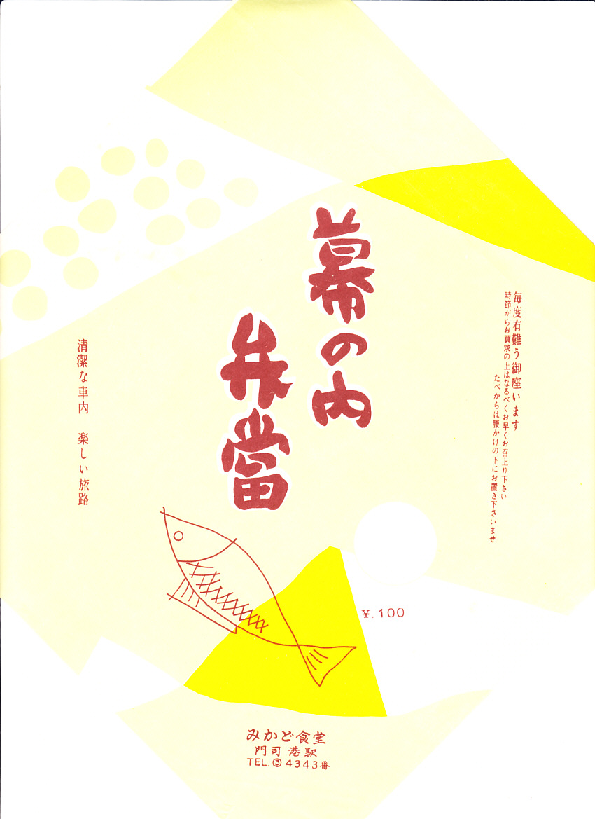 1960年代のものと思われる、昔の門司港駅弁の掛紙。かつて門司港駅舎の2階にはレストラン「みかど食堂」があり、そこで調製した持ち帰り弁当の掛紙か。