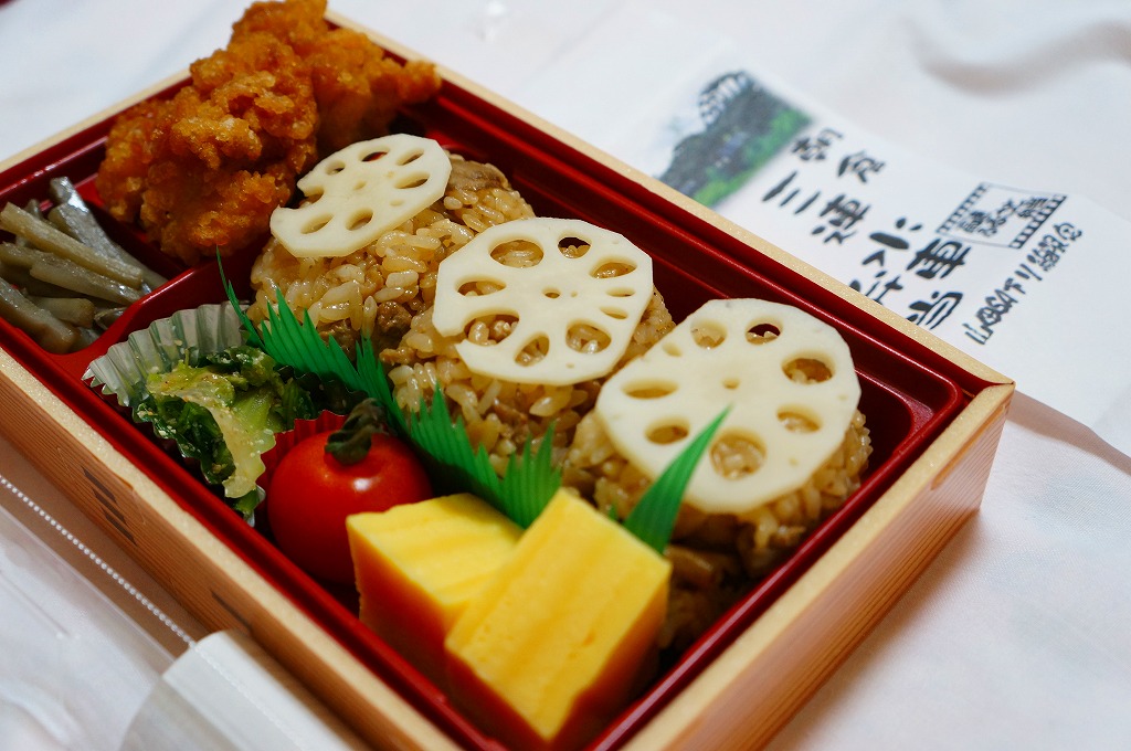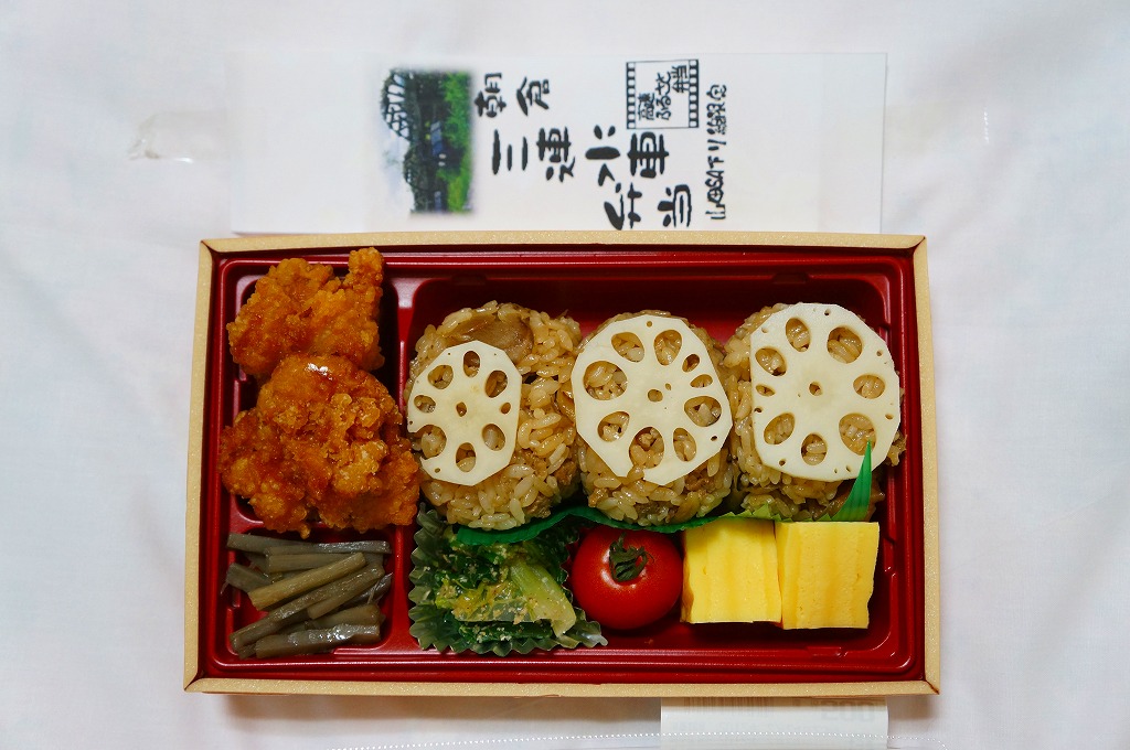 NEXCO西日本が2009年頃から九州でなんとなく展開する高速道路弁当ブランド「高速ふるさと弁当」のひとつとして、2010年までに大分自動車道山田サービスエリアで発売か。スーパーやコンビニでおなじみの平底上げ蓋の惣菜容器に、レンコンを貼ったかしわめしが3個、玉子焼2個、鶏唐揚2個、ミニトマト1個などを詰める。御飯で水車を描いたのだろう。廉価なお手軽作。