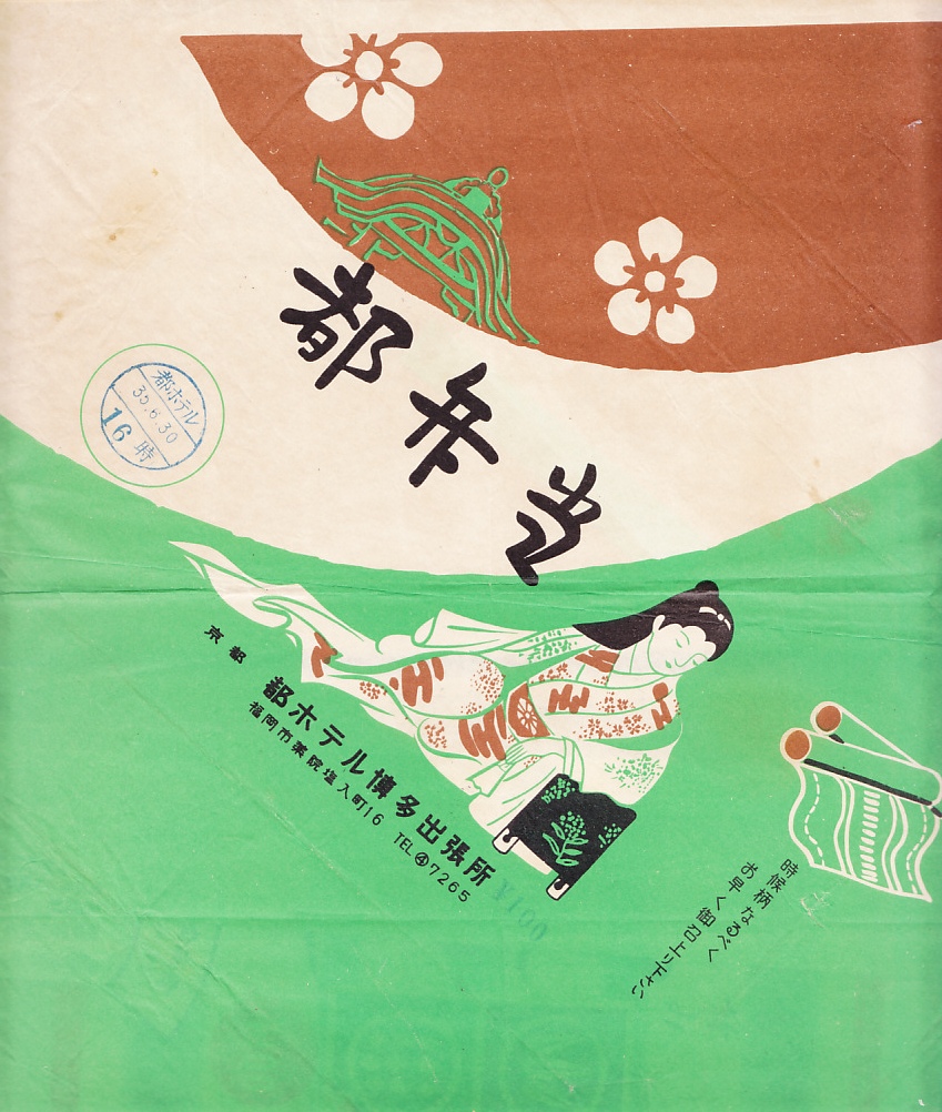 1938(昭和13)年9月に日本食堂へ統合された列車食堂つまり食堂車の営業は、第二次大戦後に一社独占を改めることとなり、1953(昭和28)年8月に東京の帝国ホテル、1956(昭和31)年11月に京都の都ホテルと大阪の新大阪ホテルが参入した。都ホテルは京都駅〜博多駅の特別急行列車「かもめ」を皮切りに、関西や東京と九州を結ぶ列車の担当を増やしていく。博多出張所はおそらくその頃の営業拠点で、この弁当は駅でなく列車内で売られたものかもしれない。都ホテルの列車食堂は後に東海道・山陽新幹線の食堂車、ビュフェ、車内販売に移行し、1990(平成2)年3月に撤退、国鉄分割民営化で日本食堂のJR東海エリアを受け継いだジェイダイナー東海に、その営業を引き継いだ。
