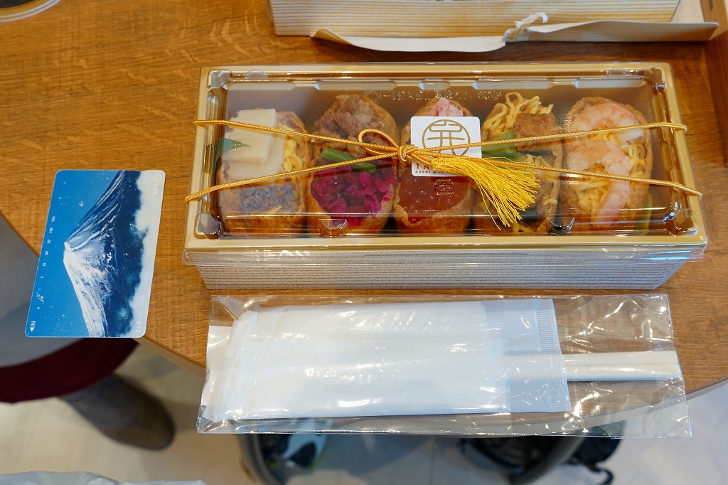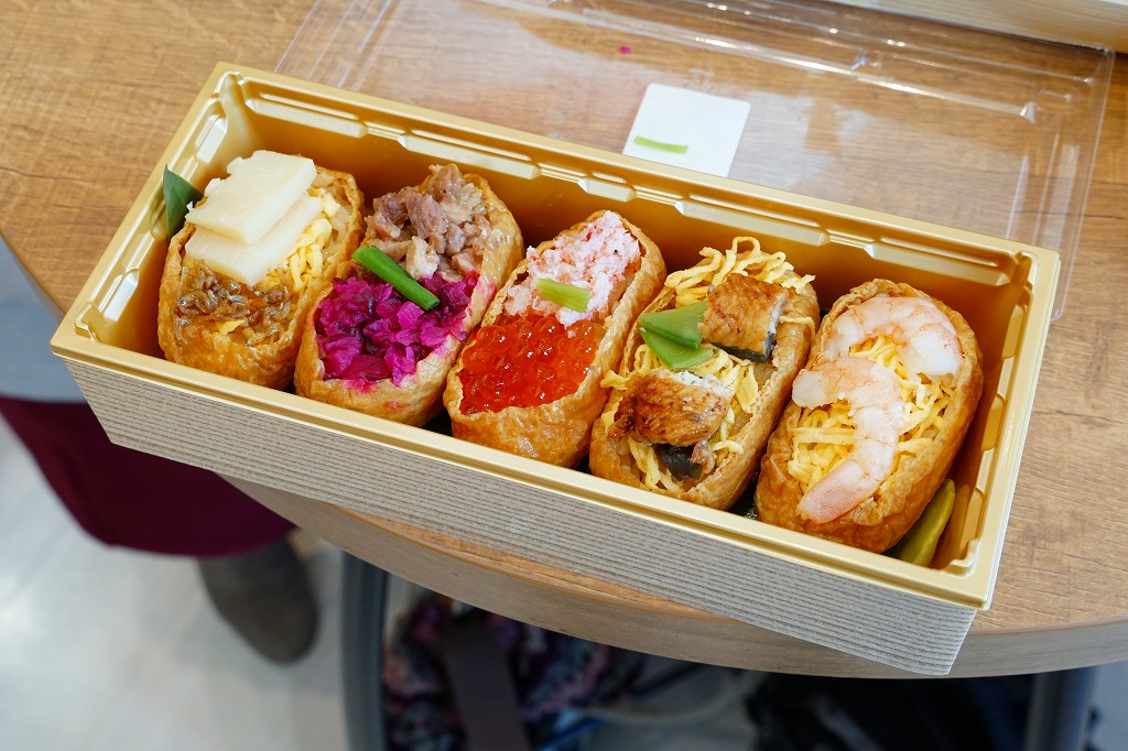 2019(平成31)年1月の阪神百貨店の駅弁大会で、博多駅の駅弁として販売。エビ、ウナギ、カニ&イクラ、肉&柴漬け、じゃこ&タケノコの、中身を見せた稲荷寿司を5個詰めて1,296円。おしゃれだけれども、激しく高価。それに、本当に博多駅で買えるのかどうかは分からない。現物に食品表示がなく、調製元は不明だが、ふたのシールに「TAKEMOTO」とあるため、福岡県小倉の寿司竹本ではないかと思われる。この催事以外で売られたのかどうかも分からない。