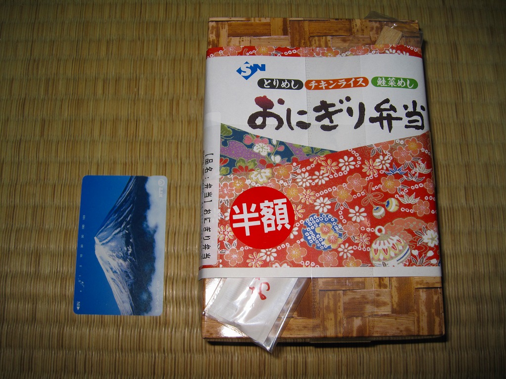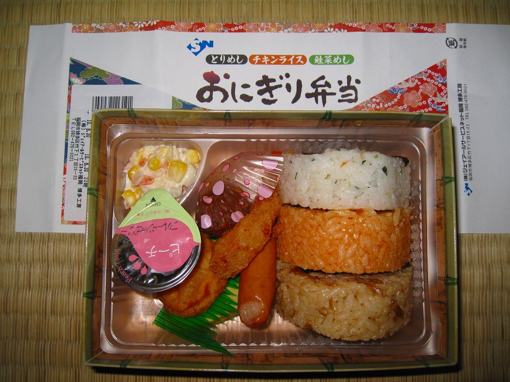 2007(平成19)年までに発売か。竹皮編みの長方形の容器に、中身の写真を掲載した掛紙を巻く。透明なトレーに収まる中身は高菜、明太子、しそ、かしわ、野沢菜の円筒形御飯が1本ずつと、焼サバ、ホタテフライ、玉子焼、シイタケやサトイモなどの煮物、ウインナー、わさび菜、昆布巻、ぎんなんが建ち並ぶもの。つまりおむすび弁当。見栄えも分量も価格も風味も、おにぎり駅弁の最高峰かと。