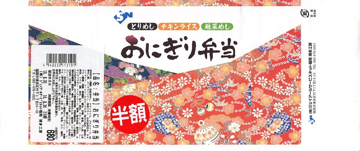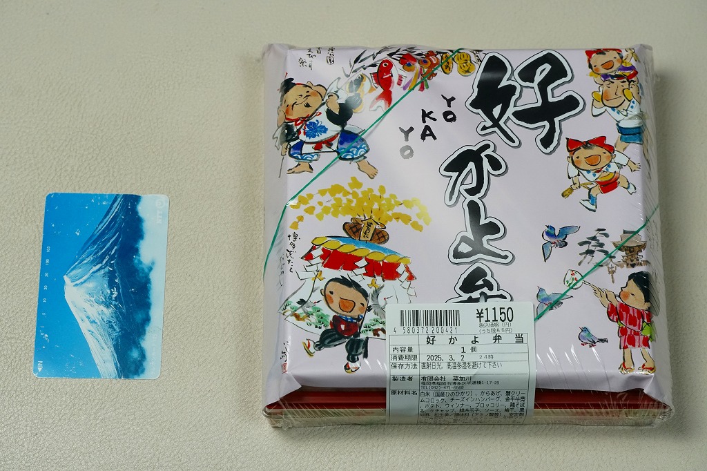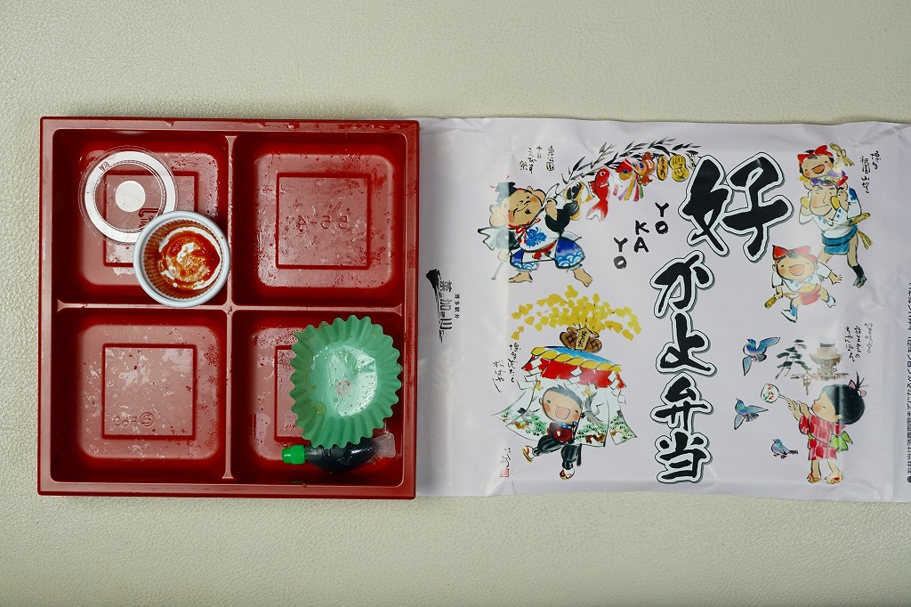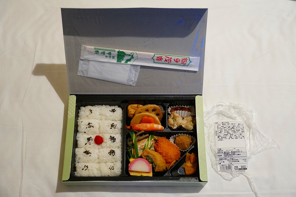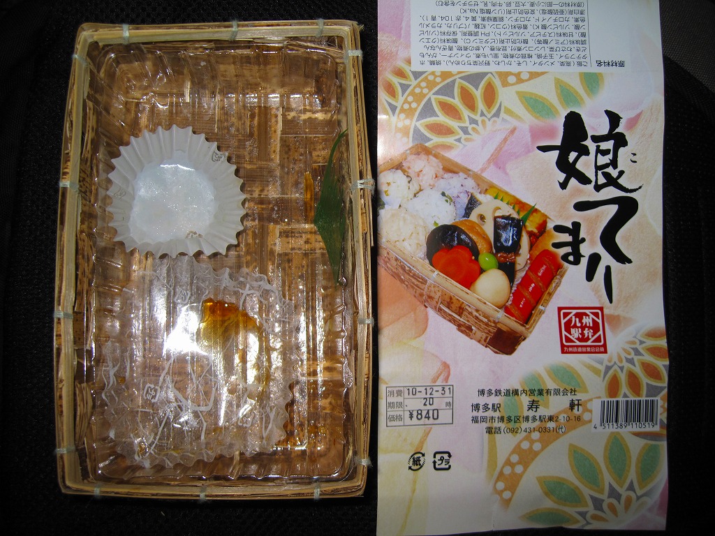 2024(令和6)年までに博多駅で発売か。松花堂弁当のような正方形の4区画に浅く平たく、白飯と黒ごま、白飯と錦糸卵と鶏そぼろと紅生姜、鶏唐揚ときんぴらごぼうとカニクリームコロッケ、チーズインハンバーグとポテトとウインナーとブロッコリーとケチャップ。福岡博多の諸行事を描いた掛紙と違い、中身は郷土料理でも幕の内弁当でも鶏飯などでもない、最近の駅弁ではあまり見なくなったお好み弁当という感じ。個性がないから実用的な道中の食事。