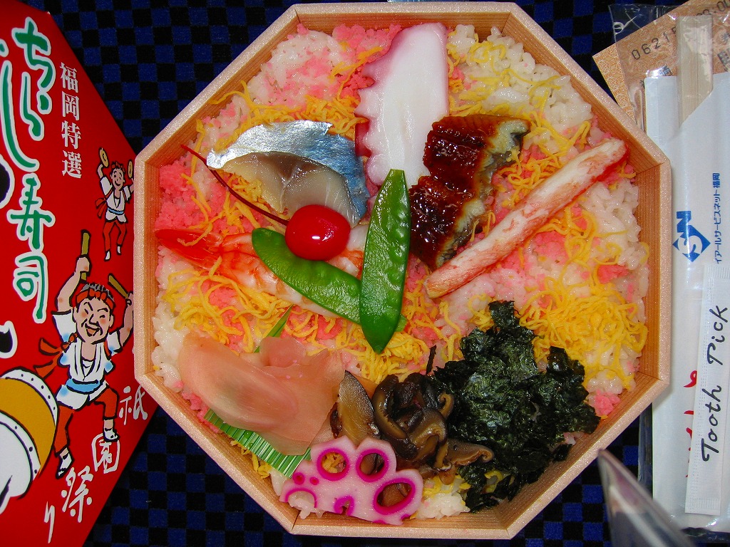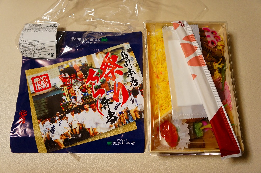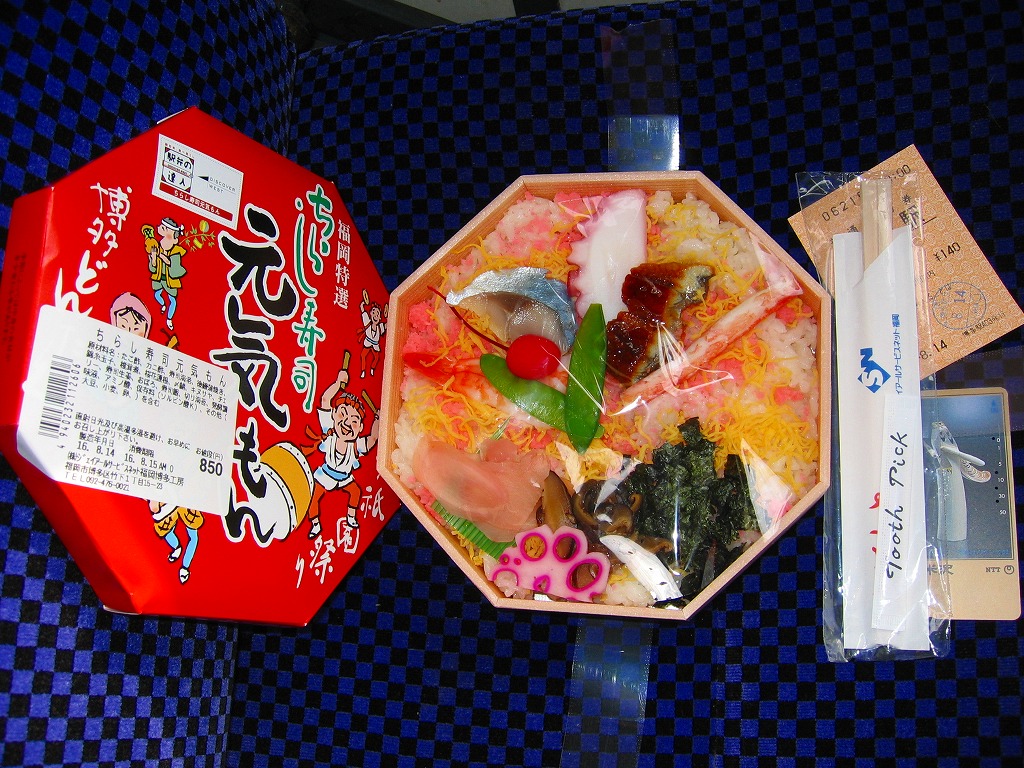 2013(平成25)年夏の新作か。長方形の木製エコ容器を、博多祇園山笠の写真を掲載した掛紙で覆う。中身は酢飯に錦糸卵を敷き、アナゴや山菜や刻みシイタケなどを載せ、焼サバ、鶏唐揚、レンコンやニンジンなどの煮物、出汁巻き玉子、水菓子などを添える。内容に特段の個性はなくても、なんとなく駅弁屋の駅弁とも、コンビニその他市販の弁当とも、異なるつくりをしているような気がする。この年限りの販売か。
