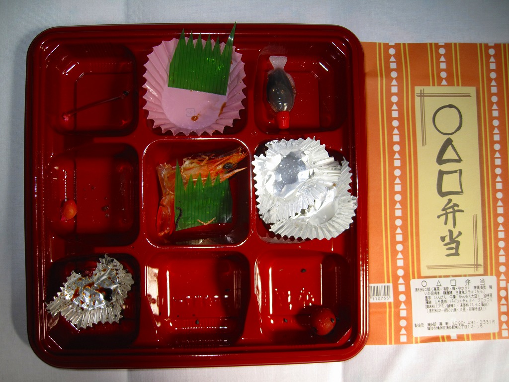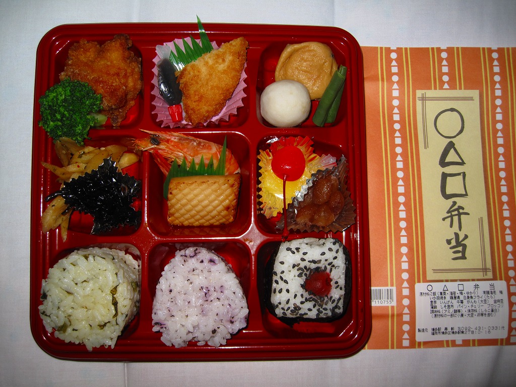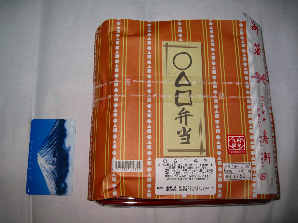 奇抜な駅弁の名前の由来や売り文句は現物にも現地にもないが、なるほど御飯の形状で○△□(まるさんかくしかく)なのかと。中身だけ見ればとんがっていない、普通のお弁当。2010年12月限りで寿軒が駅弁から撤退し、以後は小倉駅弁の北九州駅弁当が調製。価格は2010年の購入時で760円、2015年時点で800円。2016年までに終売の模様。