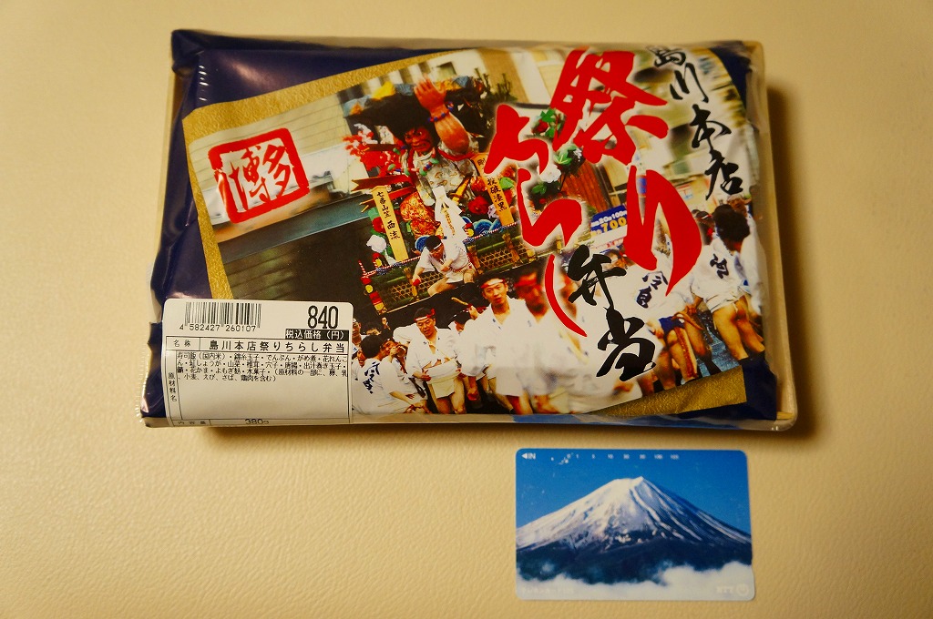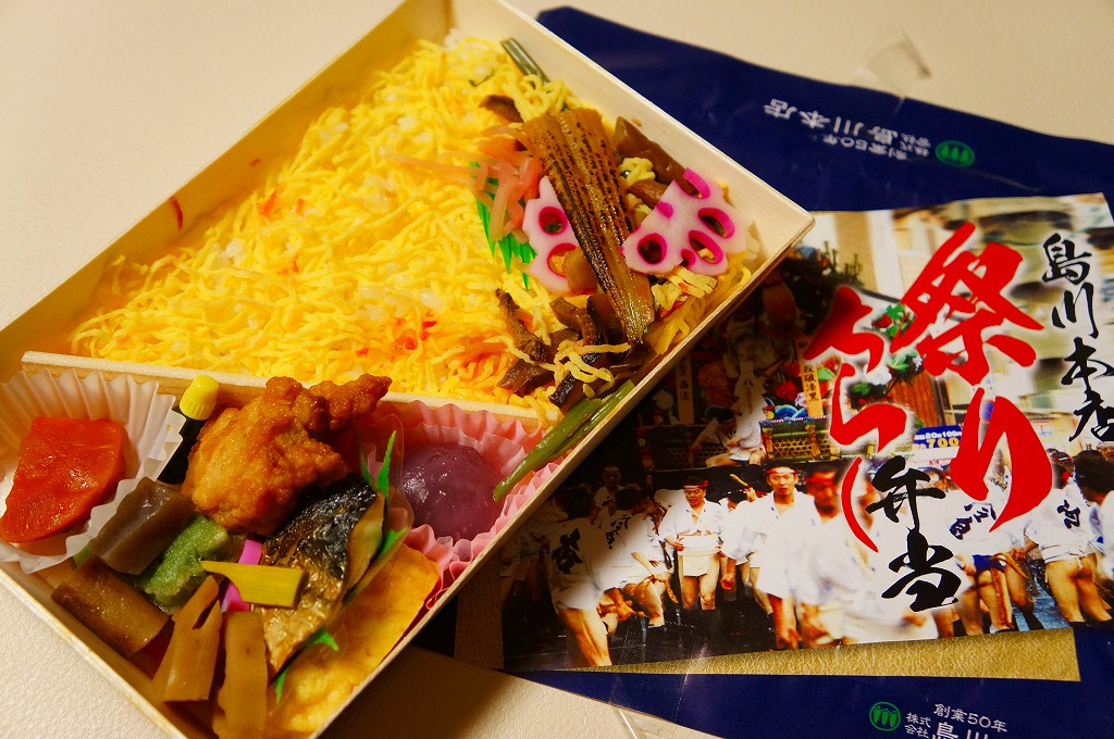 かつて蒸気機関車が日本中を走っていた頃、駅弁の幕の内弁当には上等と並等があった。現在では「上等」という言葉自体が使われなくなりつつある中で、駅弁の上等がここに生きている。祭の神輿を描いた掛紙も、なかなか古めかしい。