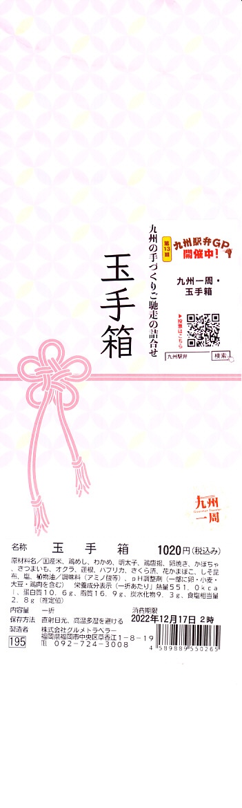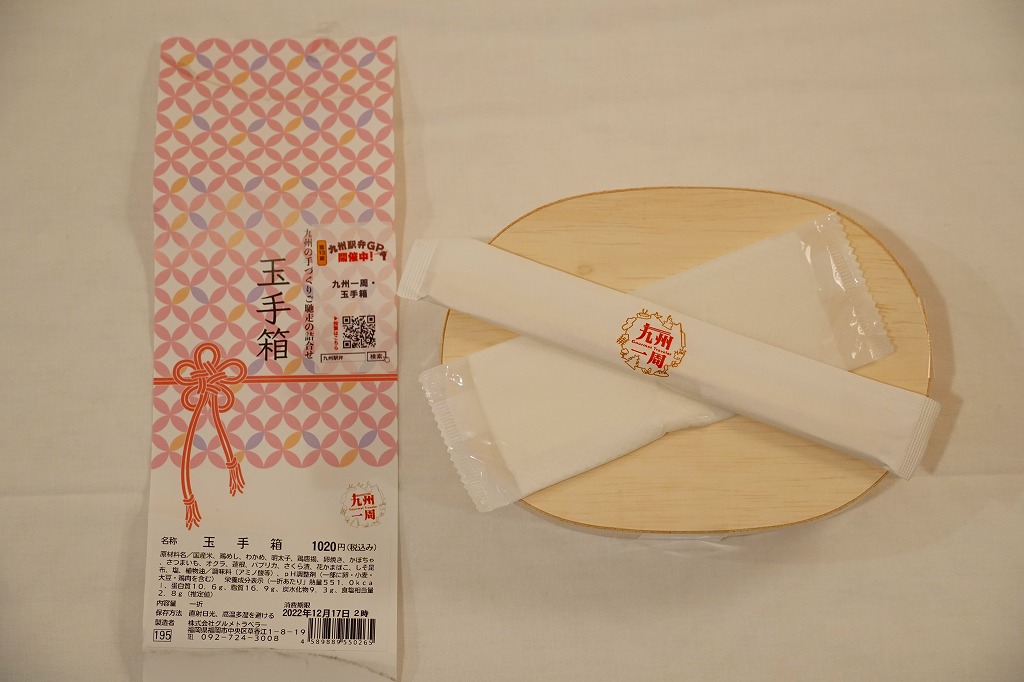 2020(令和2)年の発売か。現物から読み取りにくいが、駅弁の名前は「九州一周玉手箱」とされることがある。2022年のJR九州の駅弁キャンペーン「第13回九州駅弁グランプリ」にエントリー。この調製元はかつて「オール九州玉手箱」という駅弁を販売しており、あるいはこれのリニューアルかもしれない。楕円形の容器に、鶏めし、わかめ、明太子の球形おにぎり各1個を並べ、鶏唐揚、玉子焼、花かまぼこと、かぼちゃ、さつまいも、れんこん、オクラ、パプリカ、大根桜漬も詰める。地元の駅弁であることに違いないが、博多、福岡、九州らしさをほぼ持たない、きれいなお弁当。価格は2022年の購入時で1,020円、2023年時点で1,090円。