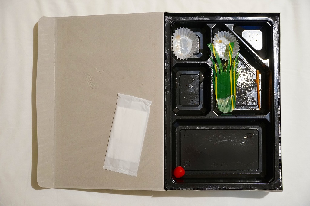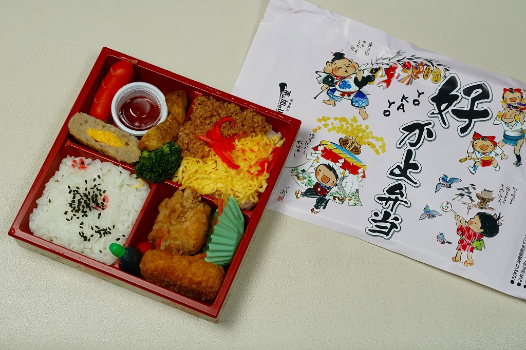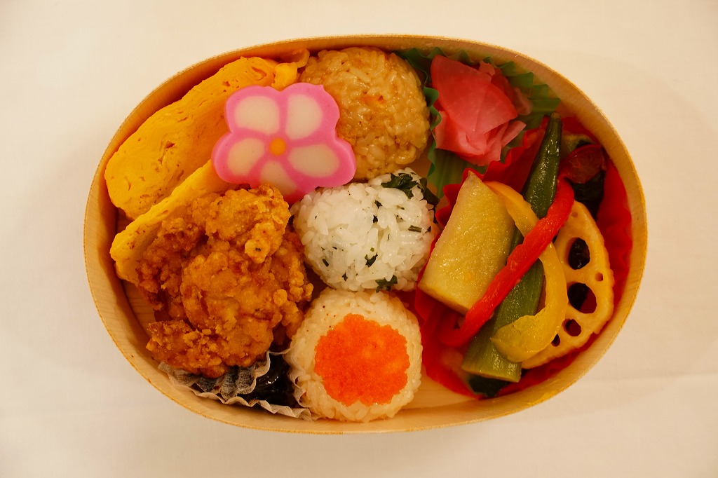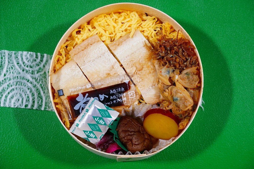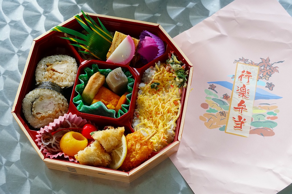 長方形の容器に、花や車両のイラストを描いたボール紙でふたをする。中身は日の丸御飯とタケノコ御飯、玉子焼、牛肉しぐれ煮、明太子、アサリ、アジ塩焼、サワラ天ぷら、肉じゃがコロッケ、タケノコなどの煮物、桜餅。