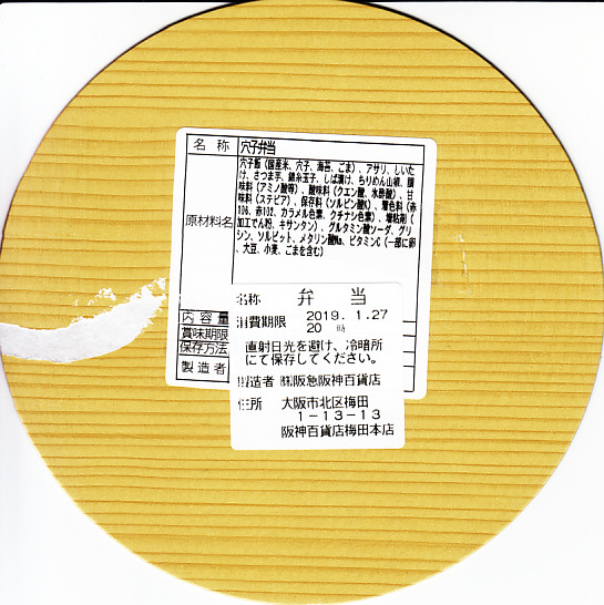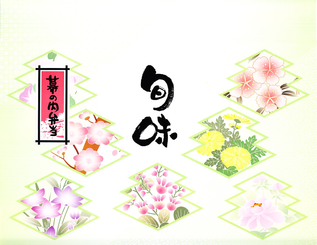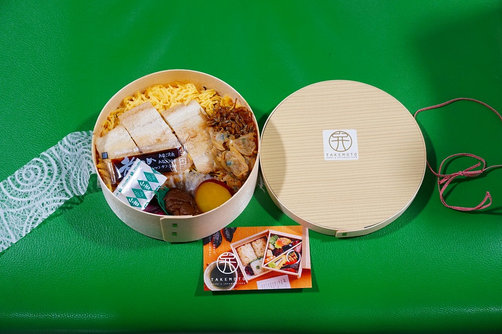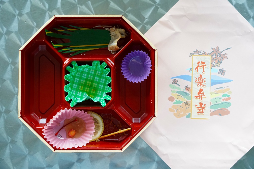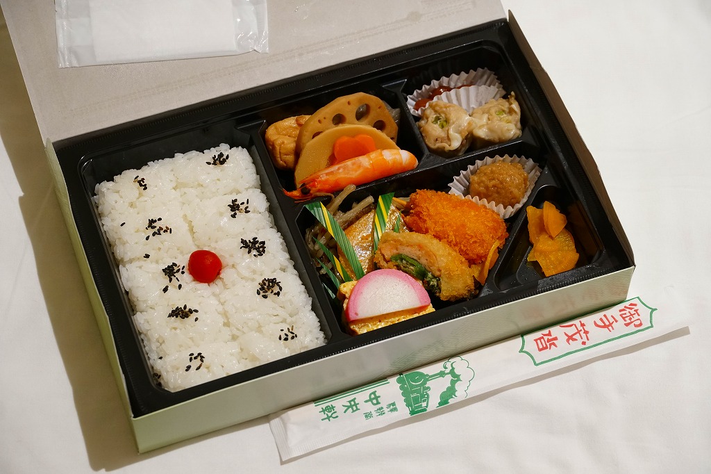 長方形の容器に、花や車両のイラストを描いたボール紙でふたをする。中身は日の丸御飯とタケノコ御飯、玉子焼、牛肉しぐれ煮、明太子、アサリ、アジ塩焼、サワラ天ぷら、肉じゃがコロッケ、タケノコなどの煮物、桜餅。