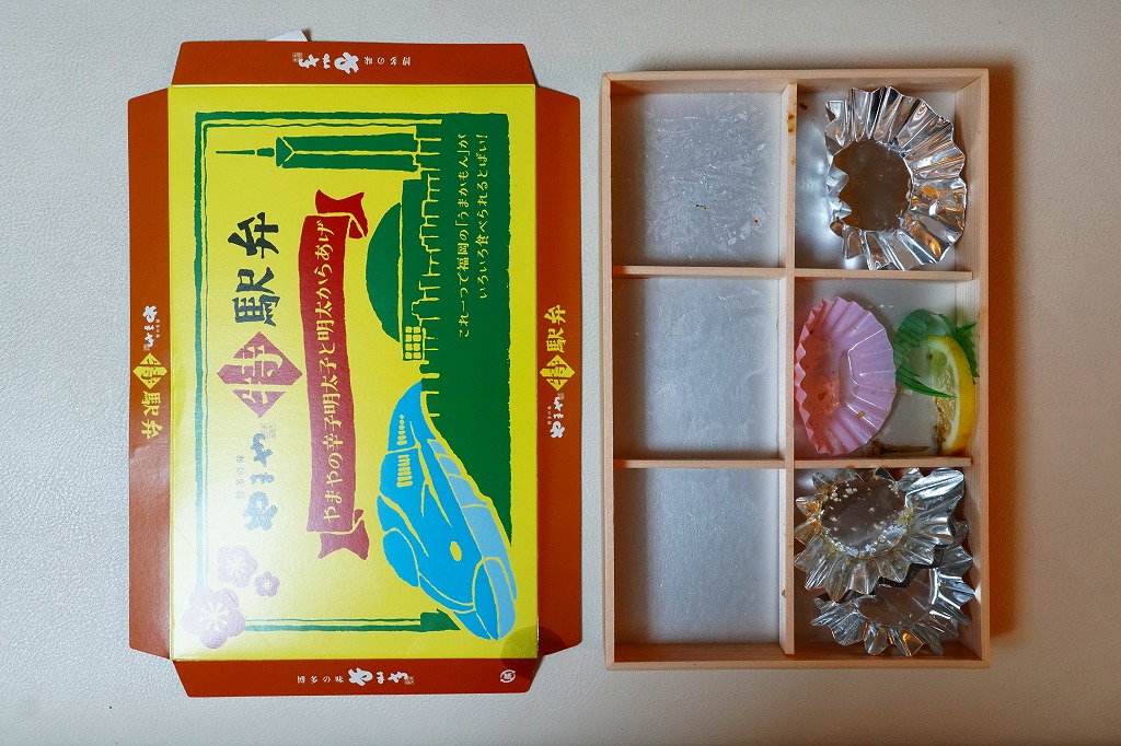 2019(令和元)年の5月までに発売か。駅弁の名前は「博多の味やまや特駅弁」とも。専用の紙箱には電車と福岡ドームと福岡タワーを描いたのだろうか。6区画の中身は、白飯と辛子明太子、「がめ煮」という筑前煮のようなもの、鶏そぼろ飯、鶏皮餃子にチキンカツ、焼サバに玉子焼に牛肉煮、酢の物とゆず大根。明太子の存在感が薄い、賑やかなお弁当。調製元の博多いもっ子屋は、以前に天神のバス弁を調製していた惣菜店で、2017年頃から博多駅の駅弁売店に弁当を卸し始めたらしい。
