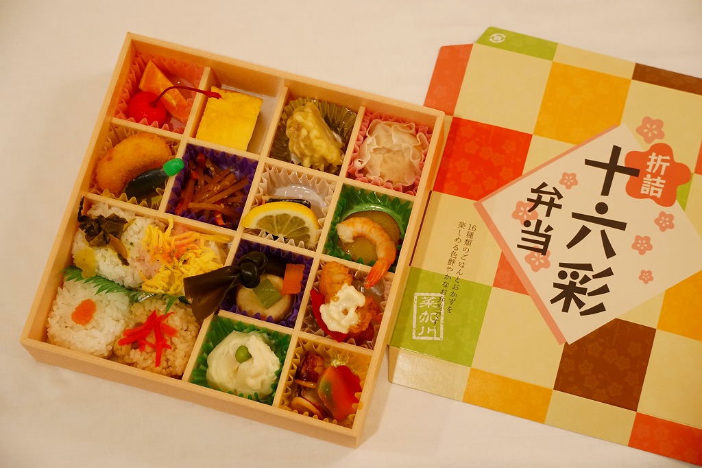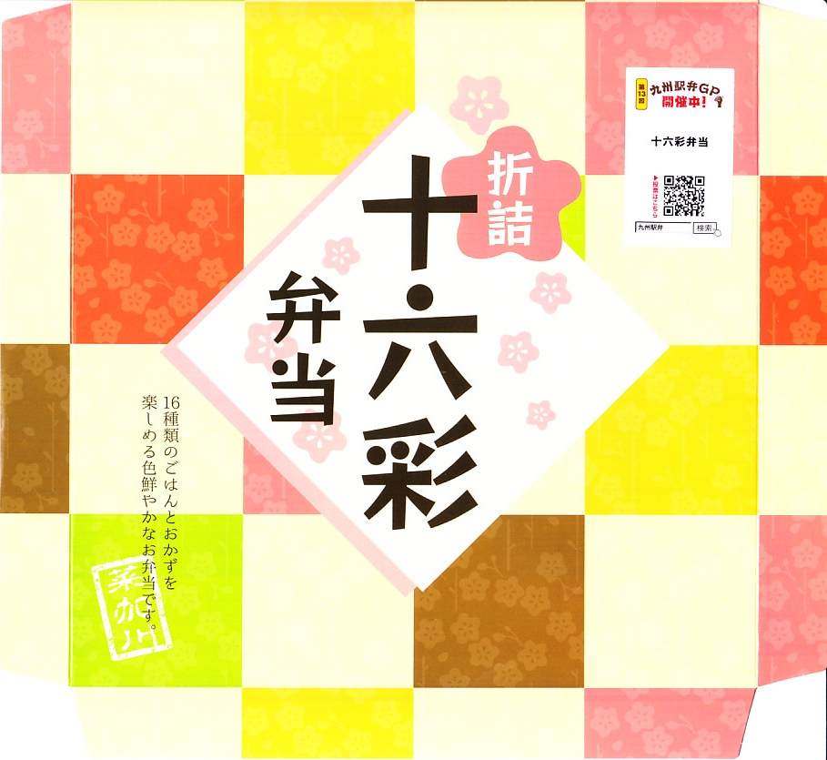2017(平成29)年までに発売か。調製元の団体・旅行会社専用弁当に同じ名前の商品があり、それを駅弁らしく仕立てたものかもしれない。商品名に市松模様のふたには、「16種類のごはんとおかずを楽しめる色鮮やかなお弁当です。」と書いてある。中身はそのとおり13区画に16種類あり、かしわ、ちらし、高菜載せ、明太子載せで4種類の球形御飯に、ポテトサラダ、イカリングと紅葉夫、昆布の結びとがんも、鶏唐揚、帆立風味フライ、きんぴらごぼう、焼鮭、海老とサツマイモ、オレンジとチェリー、玉子焼、ちぎり天、海老風味しゅうまい。これは賑やかな、おつまみ弁当。