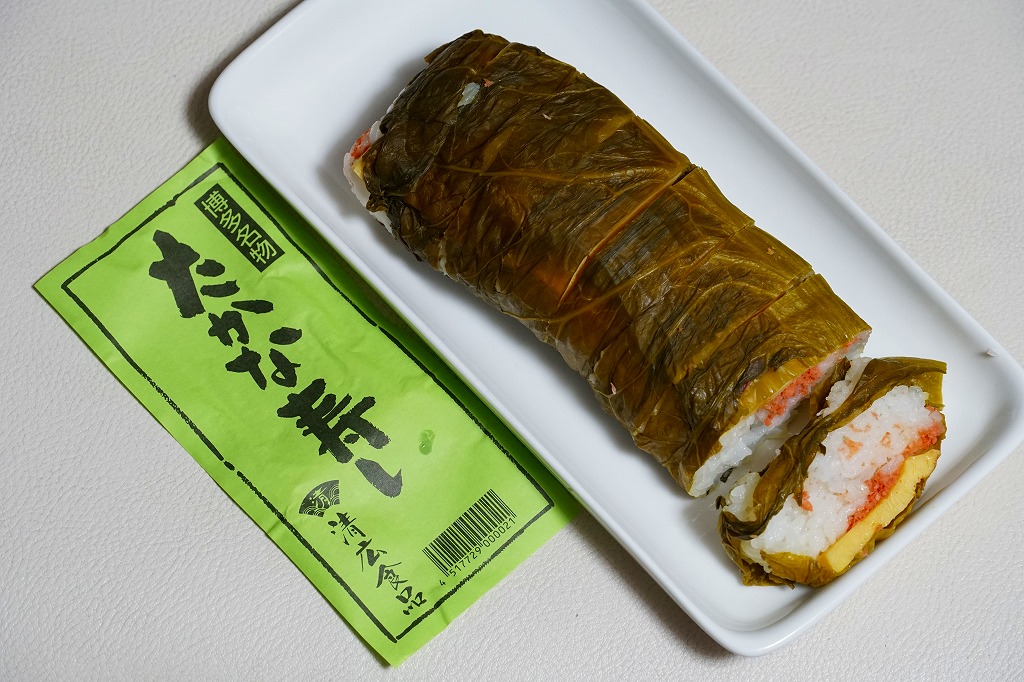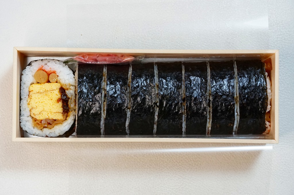 2022(令和4)年の夏までに、博多駅で発売か。太巻きが1本、8切れにカットされ、細長い箱に収まり、掛紙を巻かれる。中身は掛紙の写真にあるとおり、酢飯と玉子焼とごぼうとかんぴょうを、シイタケや紅生姜などとともに海苔で巻いたもの。飯が薄く、玉子焼が厚く、たとえれば饅頭に対する薄皮饅頭のような高級品に思える。玉子焼がメインなので、味も柔らかく、極上な福巻という名に合う。高価な材料でないので、お値段は控えめ。
