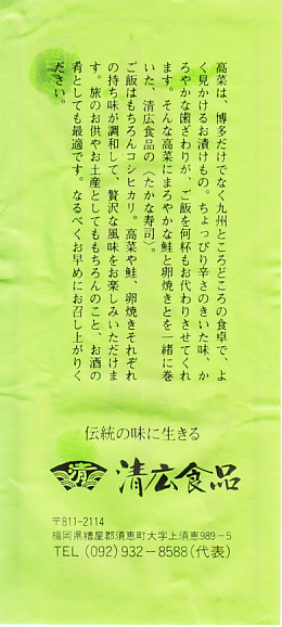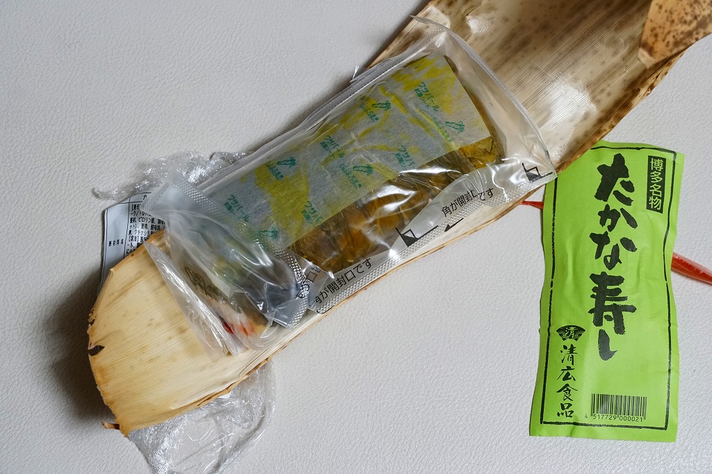 駅では1980年代に発売か。商品の名前どおりのたかな寿しが、玉子焼と鮭フレークを貼り付けたコシヒカリの酢飯を、高菜の漬物で巻いて、8切れにカットして透明な袋に密封し、竹皮で包んで掛紙を置き、ひもで縛りラップを巻く。駅弁として紹介されることはなくても、在来線特急「有明」が走り車内販売があった頃から、この地におなじみの存在。「いわしずし」「さばずし」とこれの3種類が、姿を変えずに売られる。福岡空港の空弁と紹介されることもある。価格は2010年時点で840円、2015年時点で870円。2022年に廃盤か。