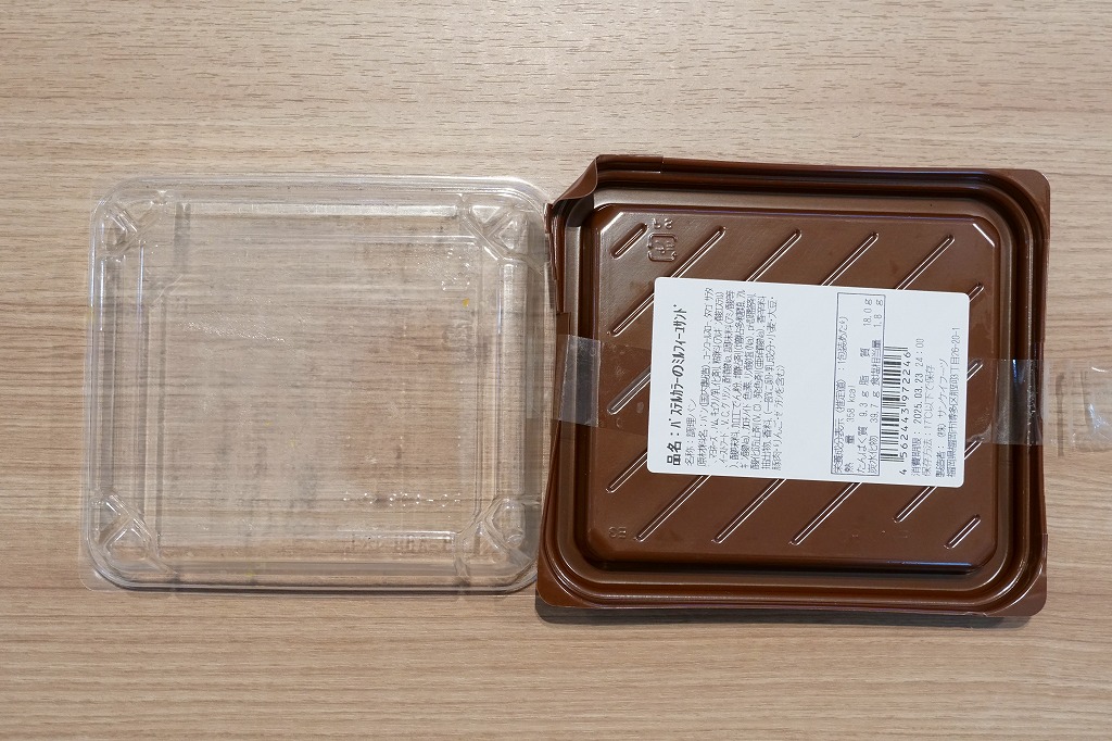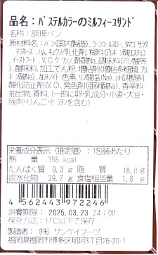博多駅の駅弁売店で買えたサンドイッチ。サンドイッチ惣菜向けのプラ容器に、オードブルで出てきそうな四角く小さなサンドイッチが、四方に向いて4個。耳なし食パン5枚で、コーンコールスロー、タマゴサラダ、きゅうり、ハムを4層に挟むため、ミルフィーユの名を付けたのだろう。味もかわいらしく。駅弁屋や車内販売が箱サンドを売る時代が過ぎ、列車内でサンドイッチを調製した食堂車やビュフェの存在は歴史の向こうに。そんな役割を補うこんな商品が、珍しくも博多駅で駅弁とともにひっそり売られていた。