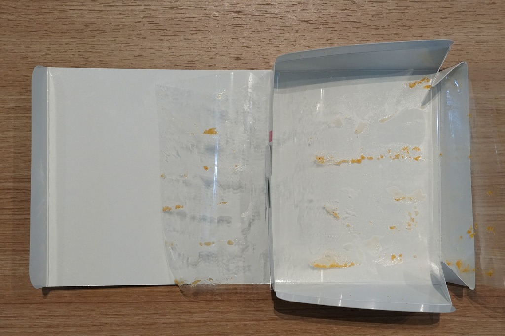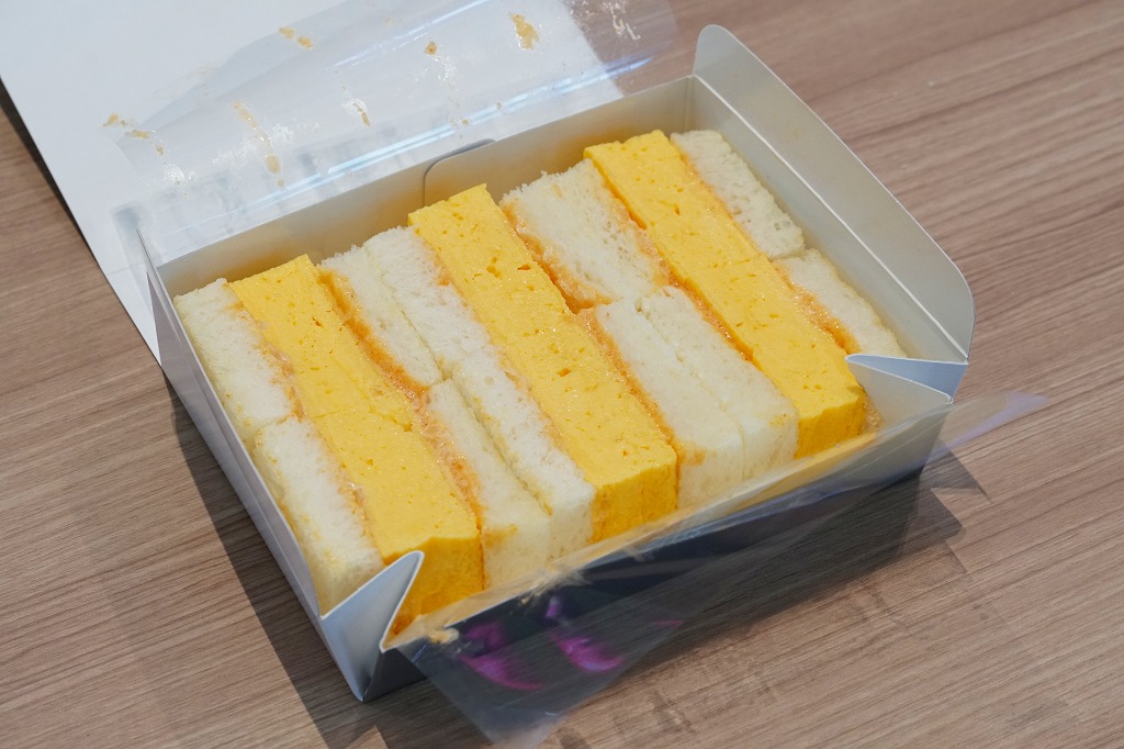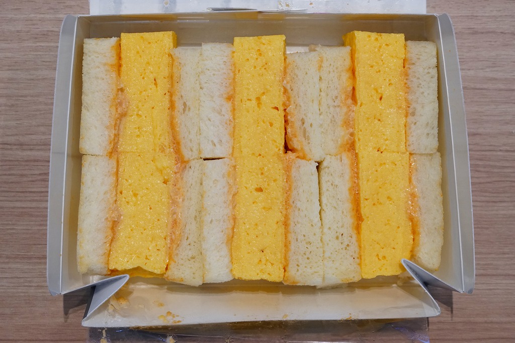 博多駅の駅弁売り場で買えたサンドイッチ。福岡市箱崎で2020年に創業しただし巻きたまご専門店の主力商品で、市内や空港や催事などで売られるものらしい。黒い箱に見える専用の紙箱に、今風なふんわり厚めの玉子焼を使うサンドイッチ。だし巻きの厚焼きたまごの両面明太マヨソースを塗り、耳なし食パンで挟んだサンドイッチを6個に分けて、フィルムを介して箱詰めする。すべてにおいて刺激がなく柔らかな、甘くないけれどスイーツのような食べ物。