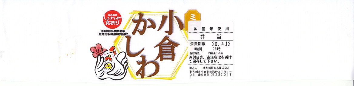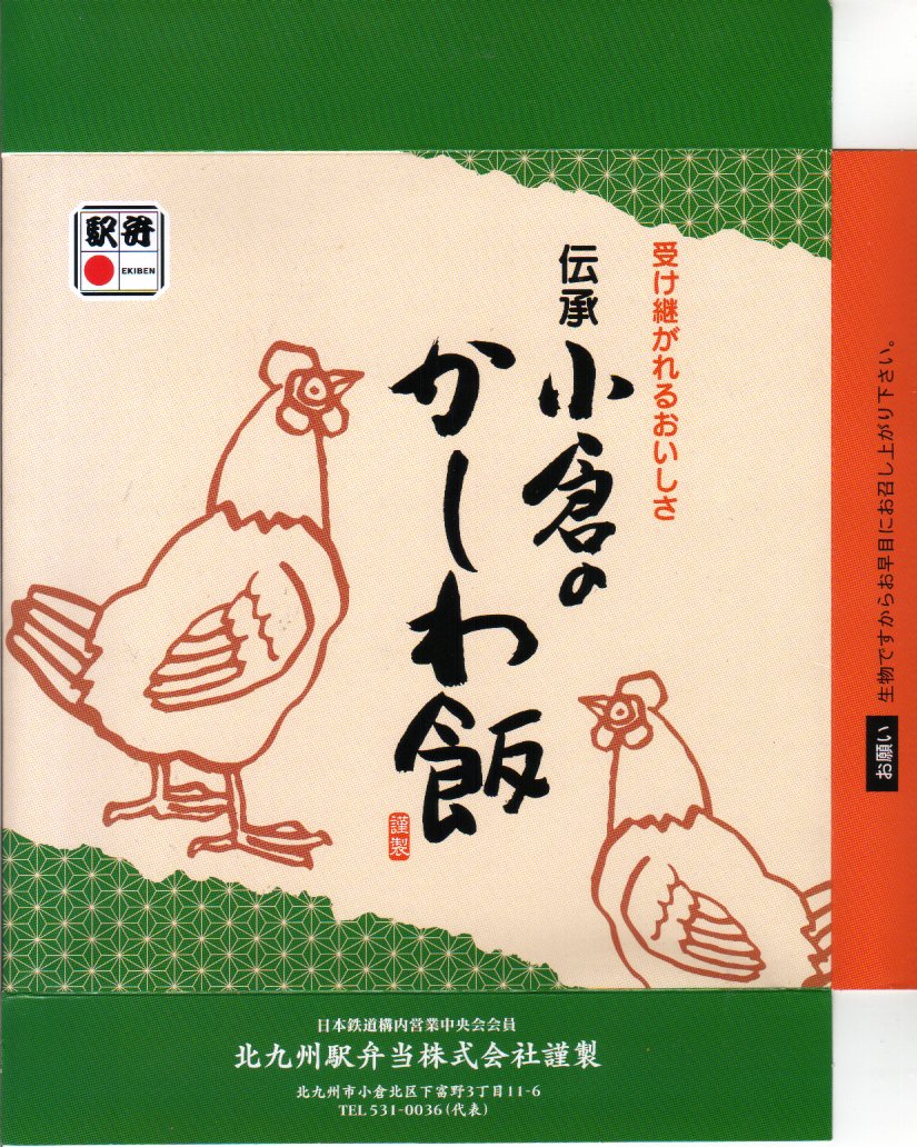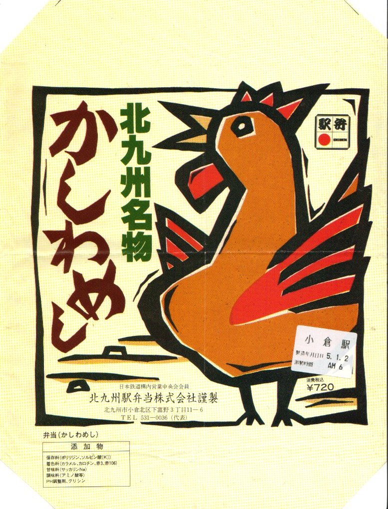 1993(平成5)年1月2日6時の調製と思われる、昔の小倉駅弁の掛紙。後の「特製かしわめし」、現在の「北九州名物鶏めし」に相当するものだろう。駅弁マークや消費税がある頃なので「昔の」とは語弊があるかもしれないが。鶏の切り絵のようなシンプルで分かりやすいデザインは、個人的には現在の物より良く見える。