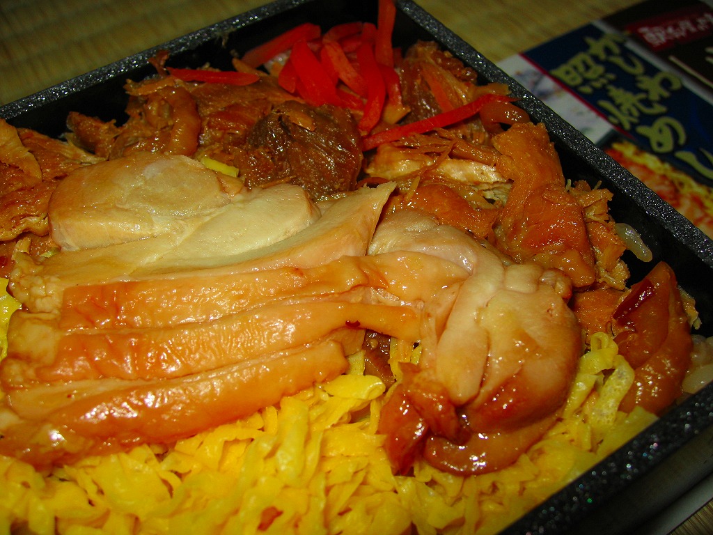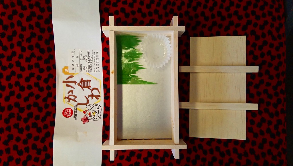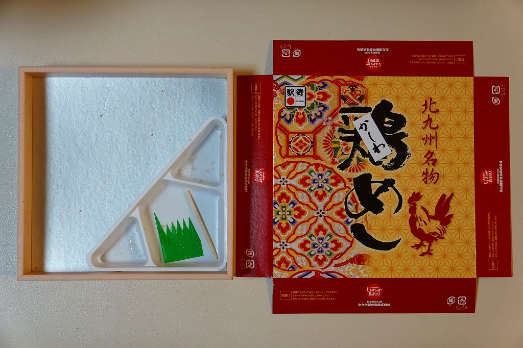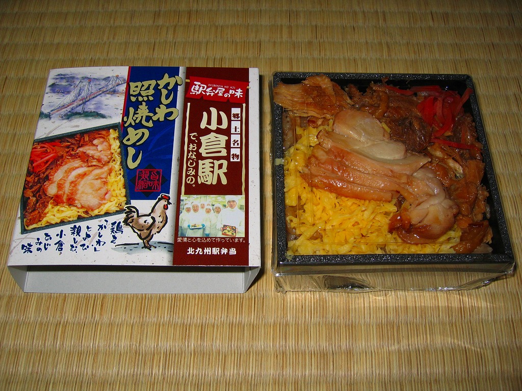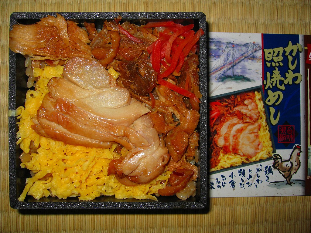 約11センチ四方の容器の中に鶏ガラスープで炊いた御飯を詰め、錦糸卵と鶏フレークと鶏照焼を貼り付ける。鶏照焼の添付を除けば内容は小倉駅弁らしいし、風味も小倉駅弁のものだが、分量に対する価格は感覚的に2割ほど高い。駅弁屋と催事屋とスーパーの三層構造でマージンがかかっていると思えば、そんなものか。