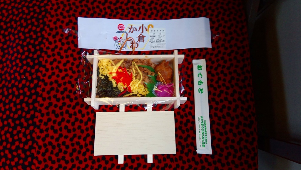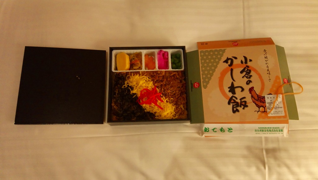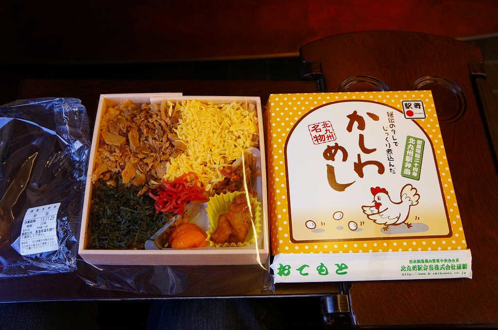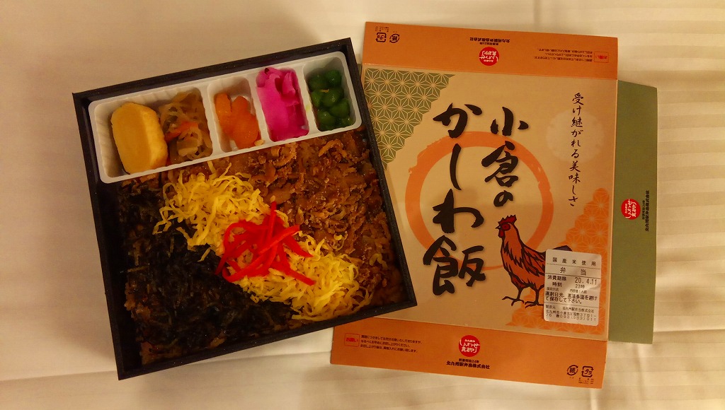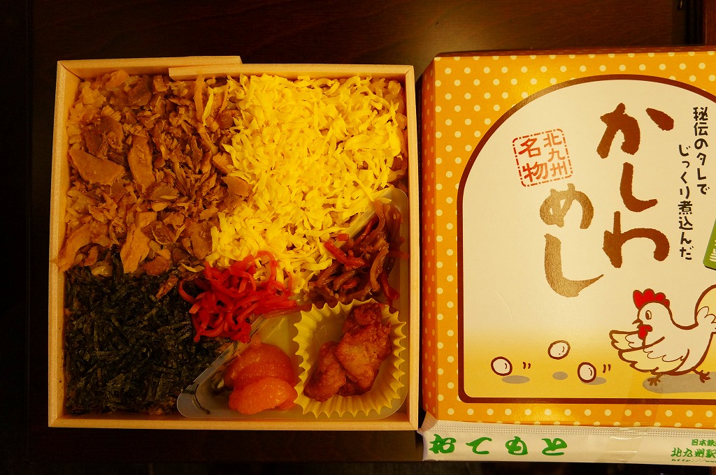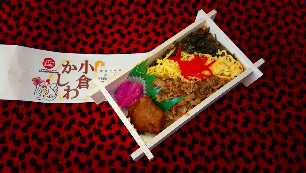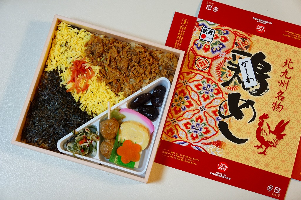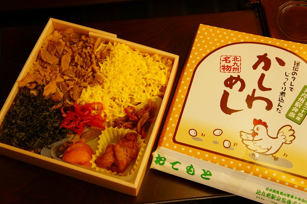 小倉駅弁のかしわめし。九州の北部を中心に各地で売られる鶏飯駅弁「かしわめし」の、小倉駅バージョン。鶏の炊込飯を、刻み海苔と錦糸卵と鶏フレークのストライプで覆い、紅生姜で彩り、玉子焼、切り干し大根、みかん、大根桜漬、うぐいす豆を添える。かしわめし駅弁の中では、付合せの行列が差異であり、味が比較的淡く薄めで、塩気や醤油味より油気が勝ると思う。スーパーやデパートでよく輸送販売されるため、関東地方など東日本では、これが折尾駅や博多駅のかしわめしだと勘違いされることがある。価格は2002年時点で680円、2010年時点で750円、2014年時点で780円。