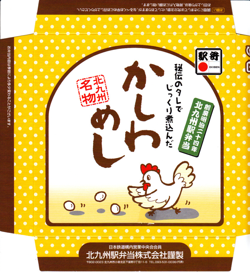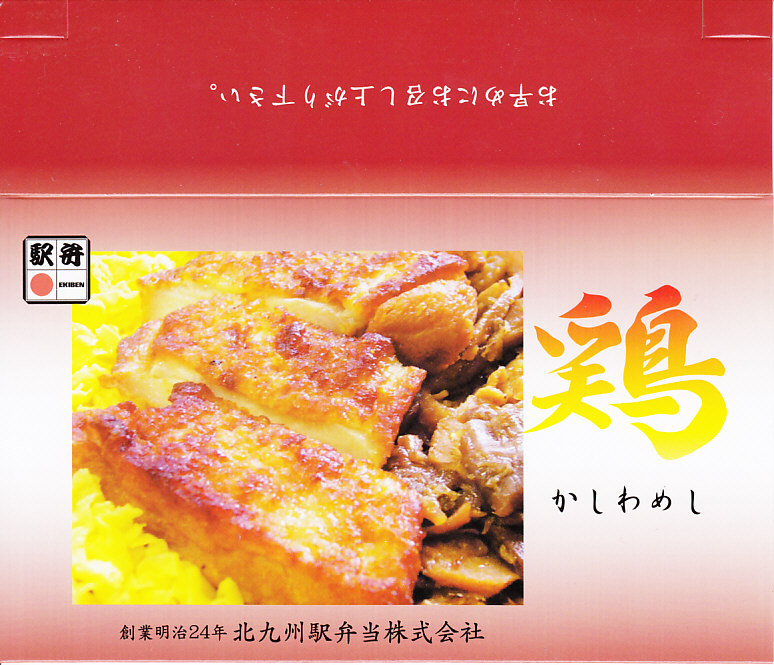 価格帯で分けて、当時の小倉駅におそらく4ランク存在した鶏飯駅弁「かしわめし」の、上から2番目のバージョン。平たい正方形の容器に鶏飯を詰め、刻み海苔と錦糸卵とかしわ(鶏)フレークでストライプを描き、玉子焼、かまぼこ、鶏肉団子、煮豆などを添える。近隣各駅のかしわめし駅弁に比べて、やや油っぽい味を持つと思う。関東地方の駅弁催事にも、よく出てきた。2018年までの販売か。