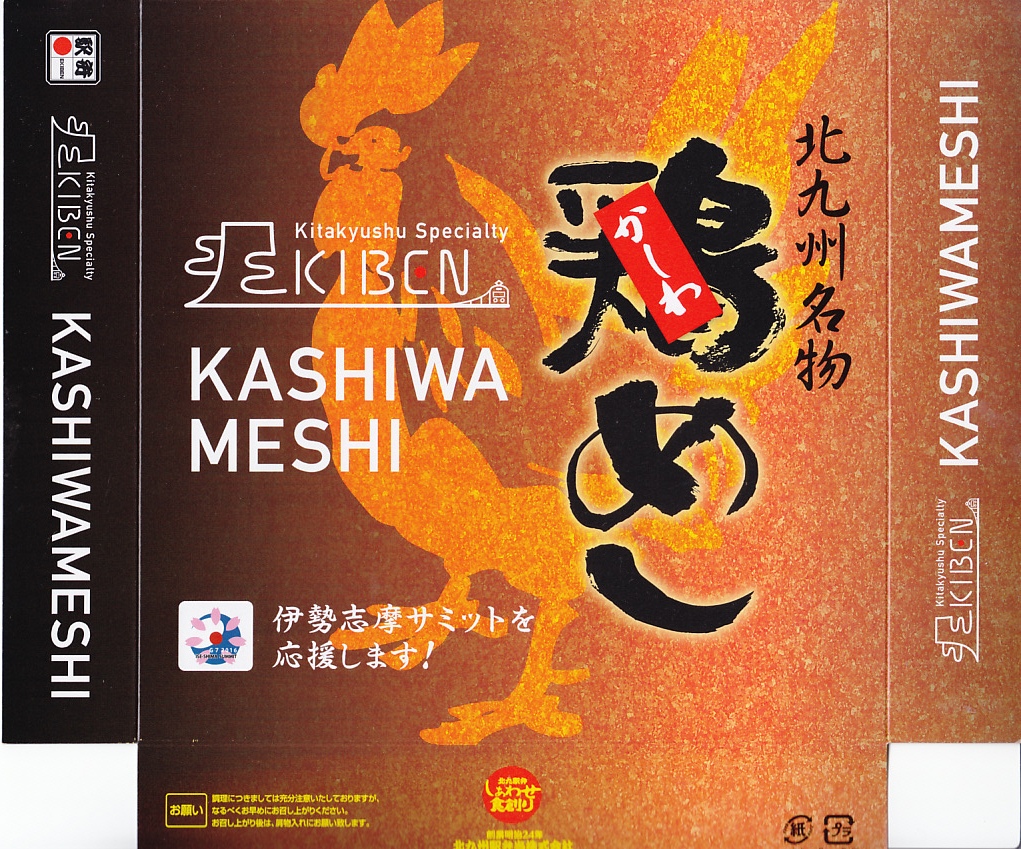 2016(平成28)年5月21日に購入した、小倉駅弁のふた。同年同月の伊勢志摩サミットの開催を記念して、仙台駅から小倉駅まで11種類の駅弁について、パッケージに駅弁の名前の英文表記とほぼ共通のロゴマークを印刷し、東京駅の駅弁売店で販売した。中身は通常版と、上記の駅弁「北九州名物鶏(かしわ)めし」と同じ。価格はなぜか30円安かった。