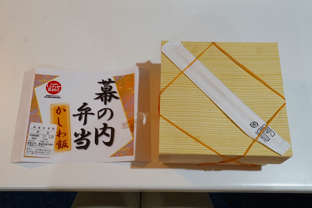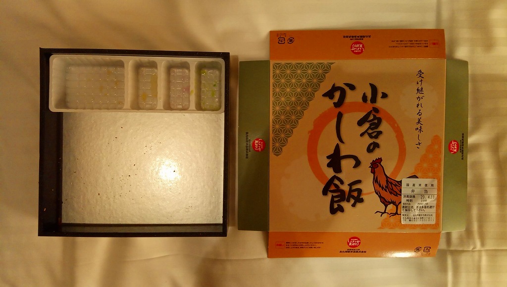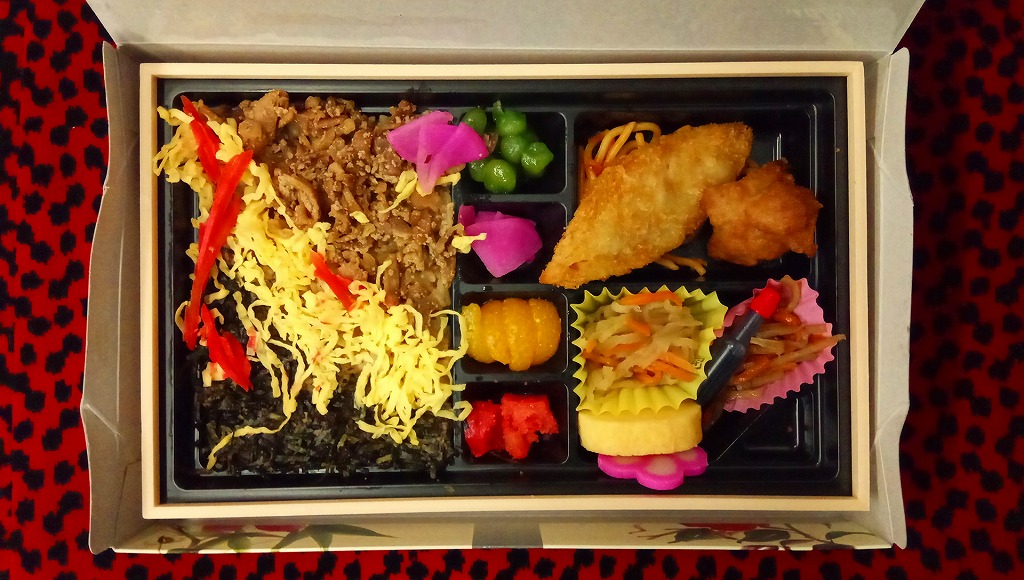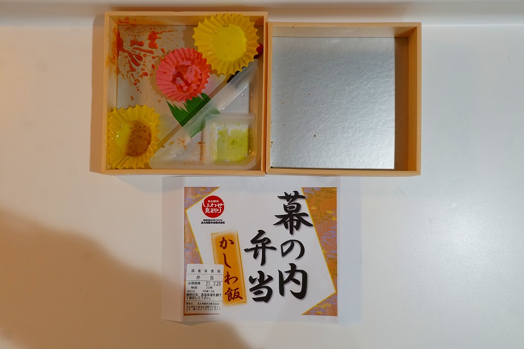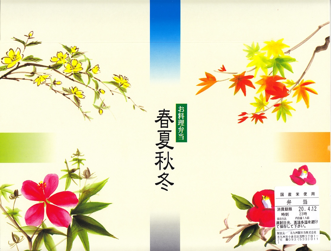 2020(令和2)年の発売か。「お料理弁当春夏秋冬」と書かれた、市販の仕出し弁当向け紙箱を使う。現物には「弁当」とあり、売場には「幕の内かしわ飯」とあった。中身の半分は、鶏炊込飯を刻み海苔、錦糸卵、鶏フレークのストライプで覆い、紅生姜を添えるかしわめし。半分は白身魚フライ、鶏唐揚、スパゲティ、切り干し大根、きんぴらごぼう、花かまぼこ、玉子焼のおかず。その間に、辛子明太子、みかん、大根桜漬、うぐいす豆の付合せ。こうして記せば、いろんなものが入っている。しかし乱雑な見栄えは、まるで場末のスーパーのお惣菜