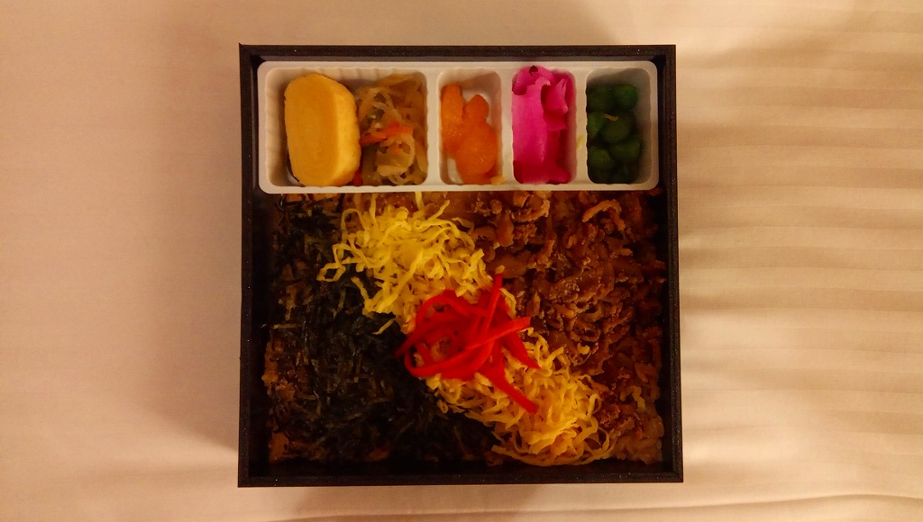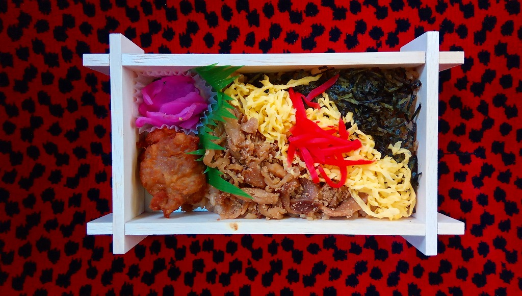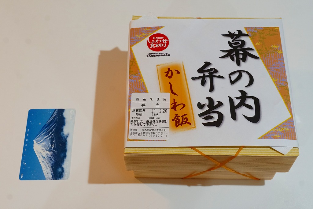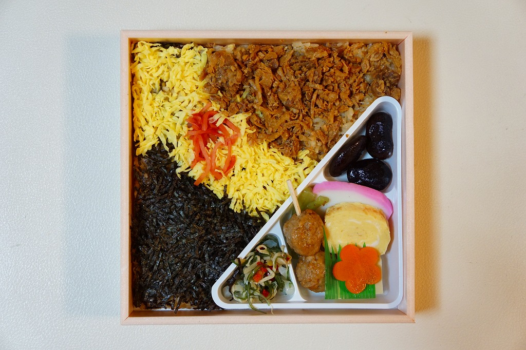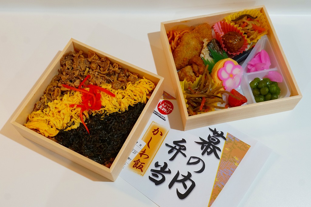 2020(令和2)年の発売か。「お料理弁当春夏秋冬」と書かれた、市販の仕出し弁当向け紙箱を使う。現物には「弁当」とあり、売場には「幕の内かしわ飯」とあった。中身の半分は、鶏炊込飯を刻み海苔、錦糸卵、鶏フレークのストライプで覆い、紅生姜を添えるかしわめし。半分は白身魚フライ、鶏唐揚、スパゲティ、切り干し大根、きんぴらごぼう、花かまぼこ、玉子焼のおかず。その間に、辛子明太子、みかん、大根桜漬、うぐいす豆の付合せ。こうして記せば、いろんなものが入っている。しかし乱雑な見栄えは、まるで場末のスーパーのお惣菜