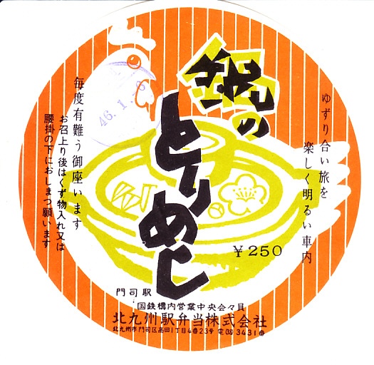 1971(昭和46)年1月6日の調製と思われる、昔の門司駅弁の掛紙。当時の駅弁紹介でよく取り上げられた、金物の取っ手と木のふたが付いた鍋型の陶器を使う鶏飯駅弁だった。