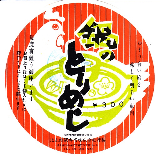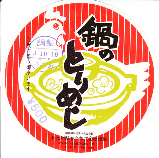 昭和50年代、1980年前後の、3月10日10時の調製と思われる、昔の小倉駅弁の掛紙。この「鍋のとりめし」は、当時に甲府駅や黒磯駅などの駅弁にも使われていた鍋形の陶器に、鶏ガラスープで炊いた御飯を詰め、とりそぼろ、玉子そぼろ、刻み海苔の3色で覆う、人気の駅弁だった。
