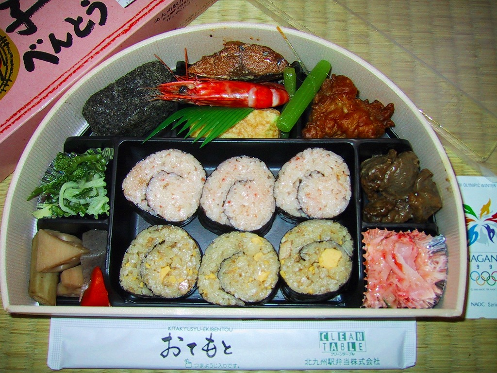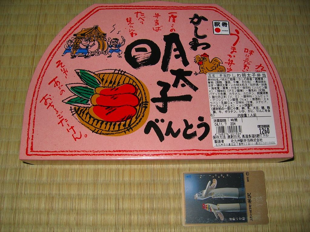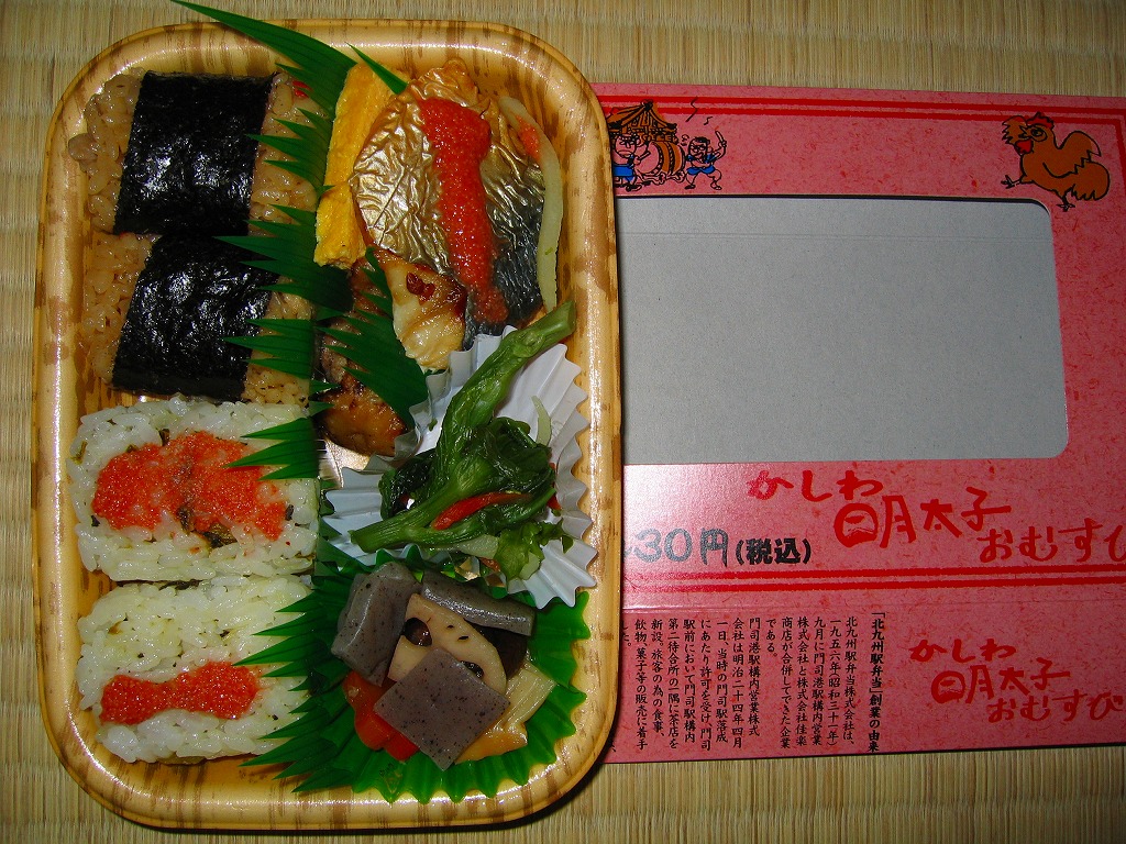 発泡材でできた大きめの半円形の容器を、明太子色のボール紙で包む。中身は中央に明太子の海苔巻きとかしわの親子海苔巻きを3つずつ置いて、その周囲を海老に唐揚げに煮物に鱒の焼き魚に玉子焼きにと多種多様なおかずが囲む。外観や駅弁の名前に反して明太子を使ったものはごくわずかで、大部分は全然辛くないから、私のような辛いものが苦手な人でも大丈夫。高めの値段相応の味と内容で「そりゃー あごの おちるごたーけん」。