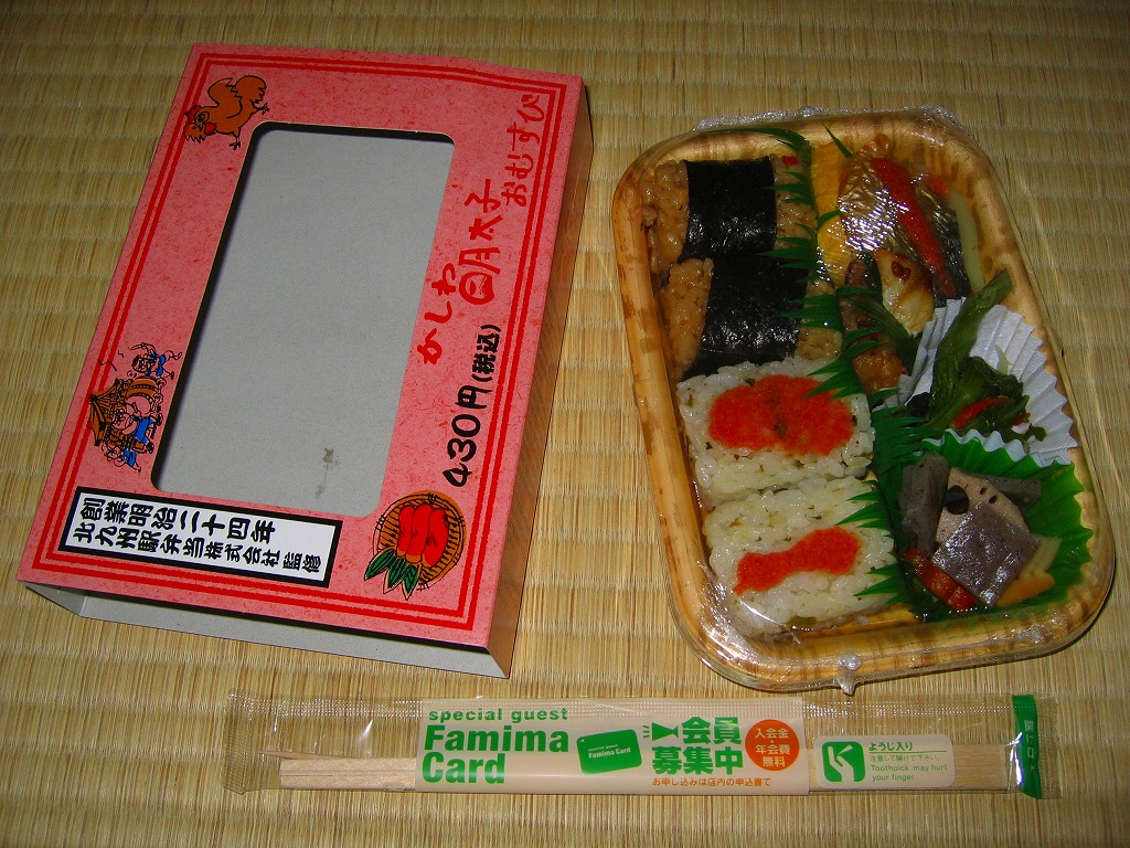 北九州駅弁当の監修により、2006(平成18)年2月21日から3月6日まで、コンビニ大手のファミリーマートの全国各地の店舗で販売された商品。明太子色の紙枠に収まった竹皮柄のプラ製トレーに、かしわの俵飯が2個と明太子の高菜俵飯が2個、小さな焼サバにも明太子がかかり、やはり小さな卵焼きや鶏肉や煮物など。