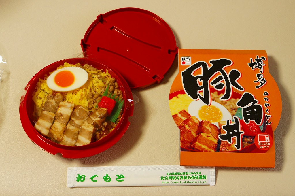 2013(平成25)年10月までに発売。同年のJR九州の駅弁キャンペーン「第10回九州駅弁グランプリ」にエントリー。他駅の駅弁でも使われる赤い釜型プラ容器を、商品名と中身の写真だけでデザインしたスリーブにはめる。中身は豚でなく鶏の炊込飯を、豚角煮、豚そぼろ、錦糸卵で覆い、小さな煮玉子と明太子を添えるもの。鶏飯はかしわめしの御飯を流用したのだろう、全体的にかなりのやっつけ感。または、シンプルで分かりやすい中身と味。2016年までの販売か。