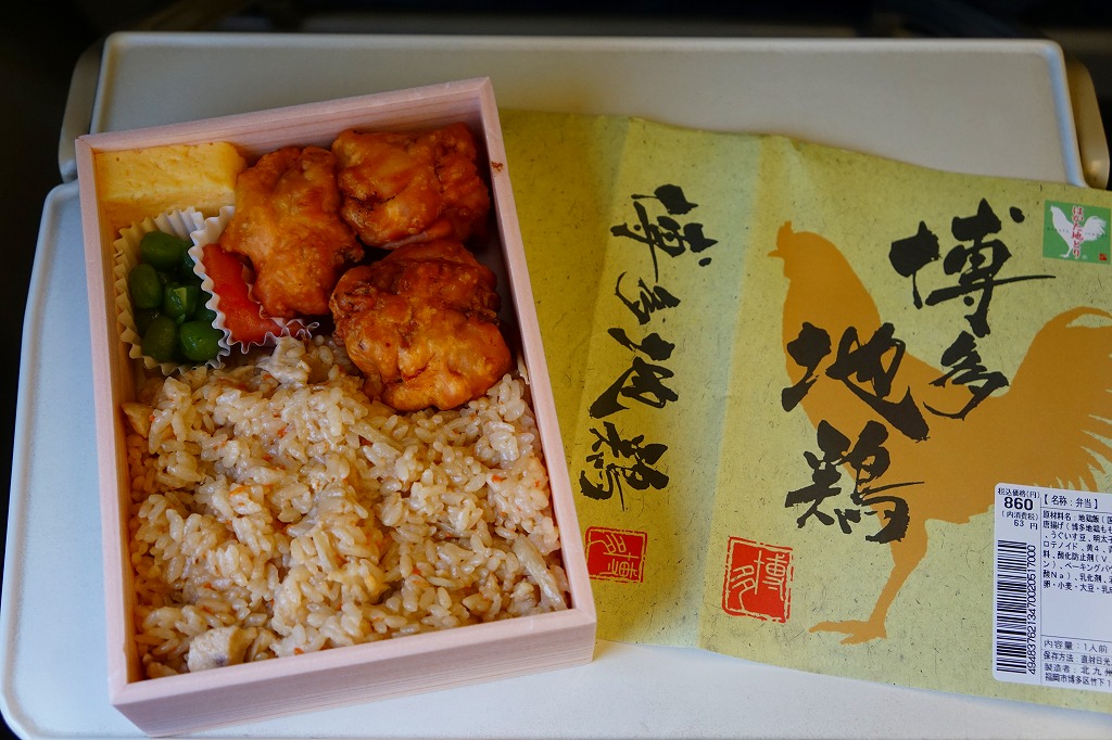 小倉駅の駅弁屋が調製し、小倉駅の駅弁売店で買えた弁当。しかし同社の駅弁に印字する駅弁マークがないなど、見栄えがなんとなく駅弁っぽくないし、商品名も小倉っぽくない。小柄で四角い容器に鶏飯を詰め、鶏唐揚3個、玉子焼、明太子、うぐいす豆を添えるシンプルな内容。原材料に博多地鶏あるいは「はかた地どり」を使うようだ。この姿と内容では、2016年頃から2017年頃までの販売か。